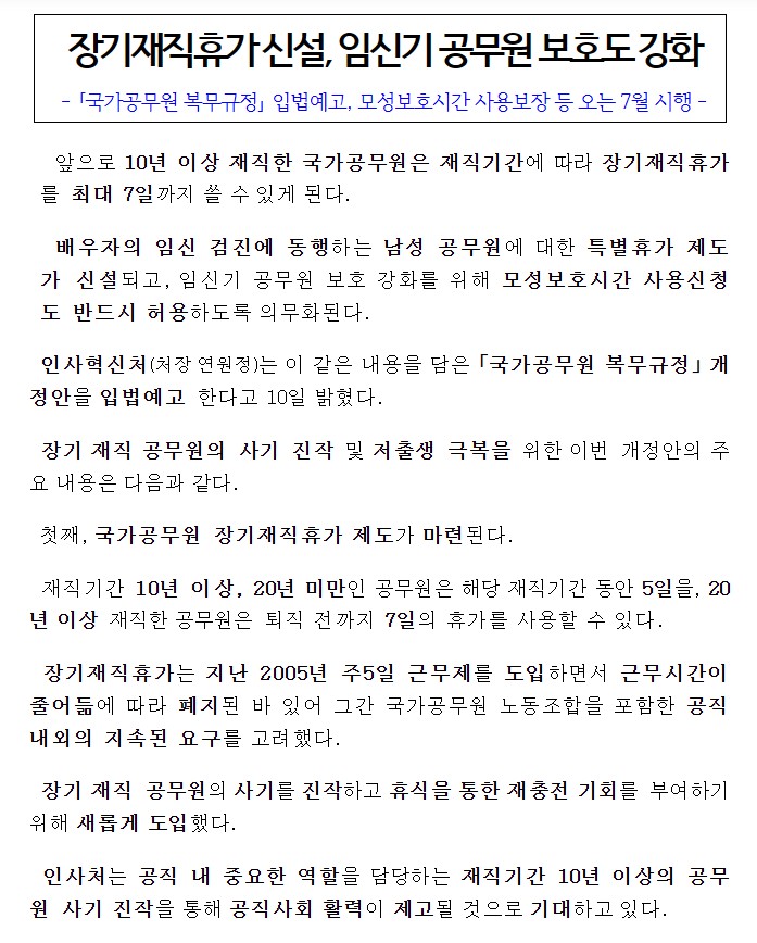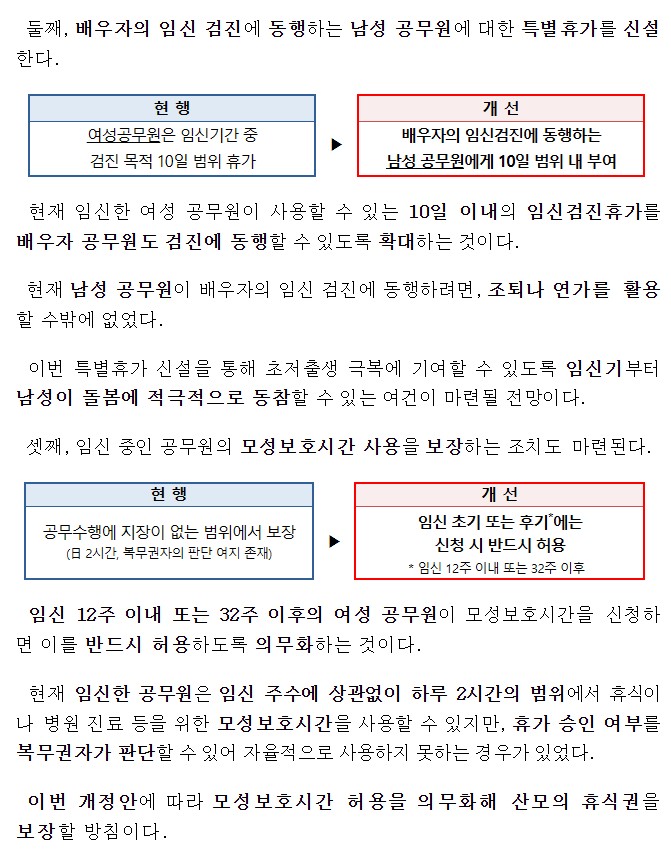 - 남성 공무원: 배우자 임신검진 동행 시 특별휴가 최대 10일