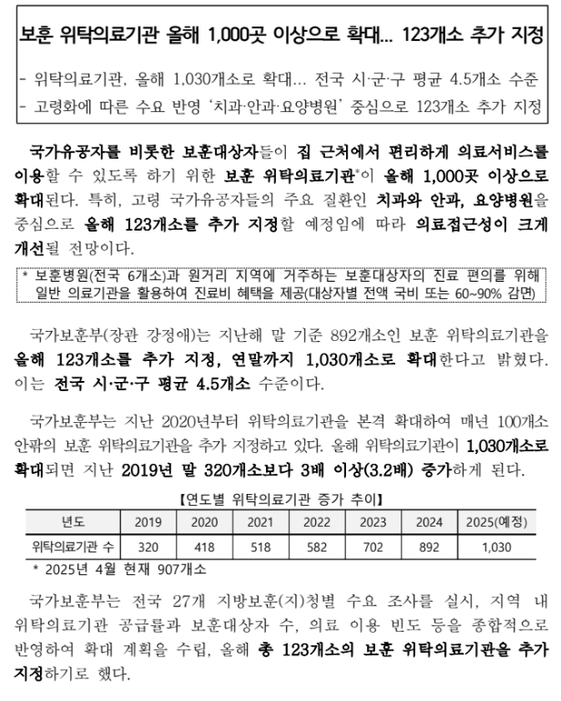 👉 2025년에는 위탁의료기관 52개소를 추가 지정하여 총 561개로 확대되었습니다. 고령 보훈가족의 의료 접근성을 높이기 위해 읍면 지역과 취약지역 중심으로 위탁병원이 늘어났으며, 지속적으로 지정 병원도 확대 예정입니다. 병원이 멀어 자주 가지 못했던 어르신들도 거주지 가까운 지역에서 진료 가능해졌습니다.