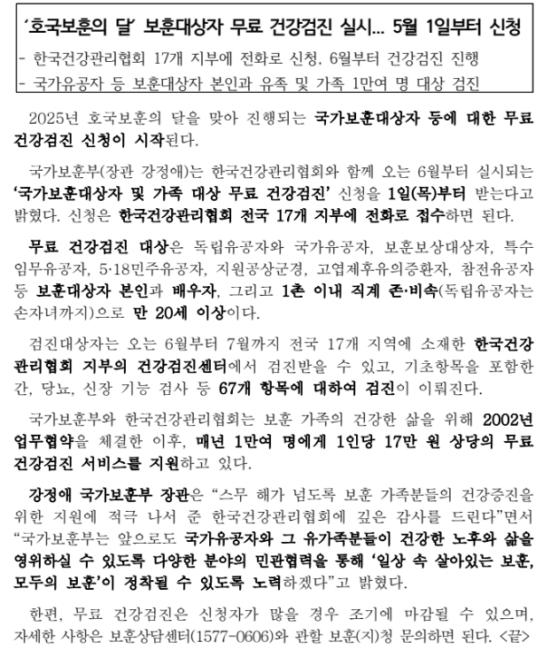 국가보훈부는 한국건강관리협회와 함께, 매년 약 1만 명에게 17만 원 상당의 건강검진을 무료로 제공합니다. 이 검진은 단순한 신체계측에 그치지 않고, 간·신장·당뇨·고지혈증·암·골다공증 등 총 67개 항목을 정밀하게 검사합니다. 일반 건강검진보다 더 폭넓고 상세하게 이루어지기 때문에, 건강이 걱정되지만 병원을 자주 찾기 어려운 분들께 매우 유익합니다. 특히 고령의 보훈가족에게는 건강상태를 점검할 수 있는 귀중한 기회가 됩니다. 검진은 전국 17개 건강관리협회 지부에서 6~7월 중 진행되며, 선착순 접수로 마감될 수 있습니다.