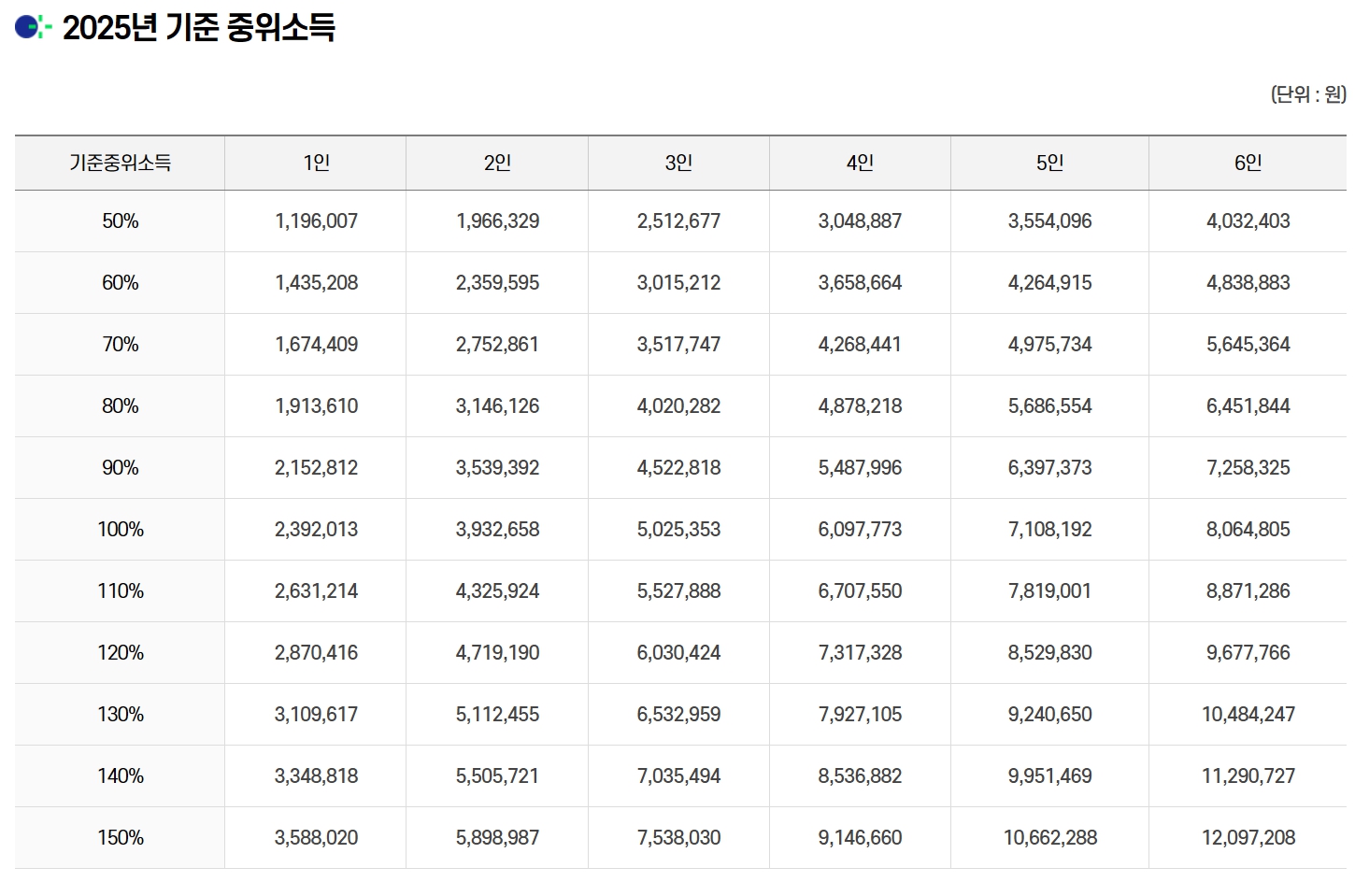 2025년 기준 중위소득 60%는 가구원 수에 따라 다음과 같습니다.