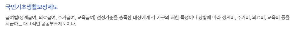 정부가 정한 소득 기준 이하인 사람에게 기본적인 의식주를 해결할 수 있도록 돕는 가장 기본적인 급여입니다.