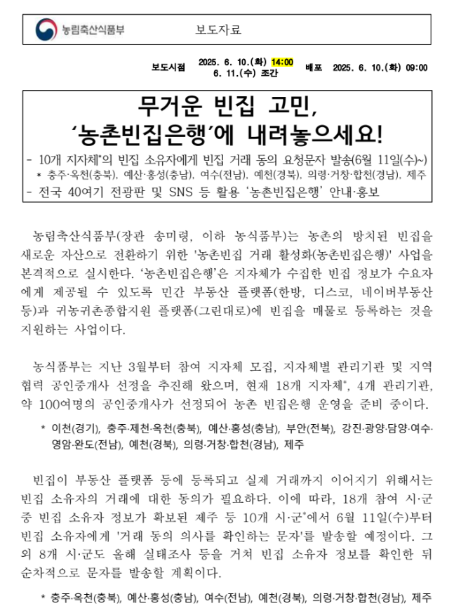 2025년 6월 11일부터, 10개 지자체의 빈집 소유자들에게 빈집 거래 동의 여부를 묻는 안내 문자가 발송됩니다. 빈집 거래 활성화를 위해 소유자의 명확한 동의가 필수이기 때문입니다. 문자를 수신한 소유자는 간단한 동의서를 확인하고 제출하면, 해당 빈집을 농촌빈집은행에 등록할 수 있게 됩니다. 등록된 빈집은 협력 공인중개사가 거래 가능성을 검토하고, 이후 매물로 표출되며 실제 거래로 이어지게 됩니다. 이번 문자는 농촌 빈집 활용의 첫 단추를 꿰는 중요한 절차인 만큼, 해당되는 소유자분들의 적극적인 응답이 필요합니다.
