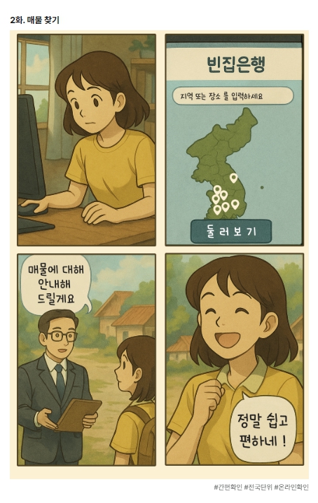 원하는 매물을 직접 방문하여 상태를 확인한 뒤, 지자체 담당자 또는 빈집 소유자와 협의합니다. - 임대 또는 매매 계약 체결