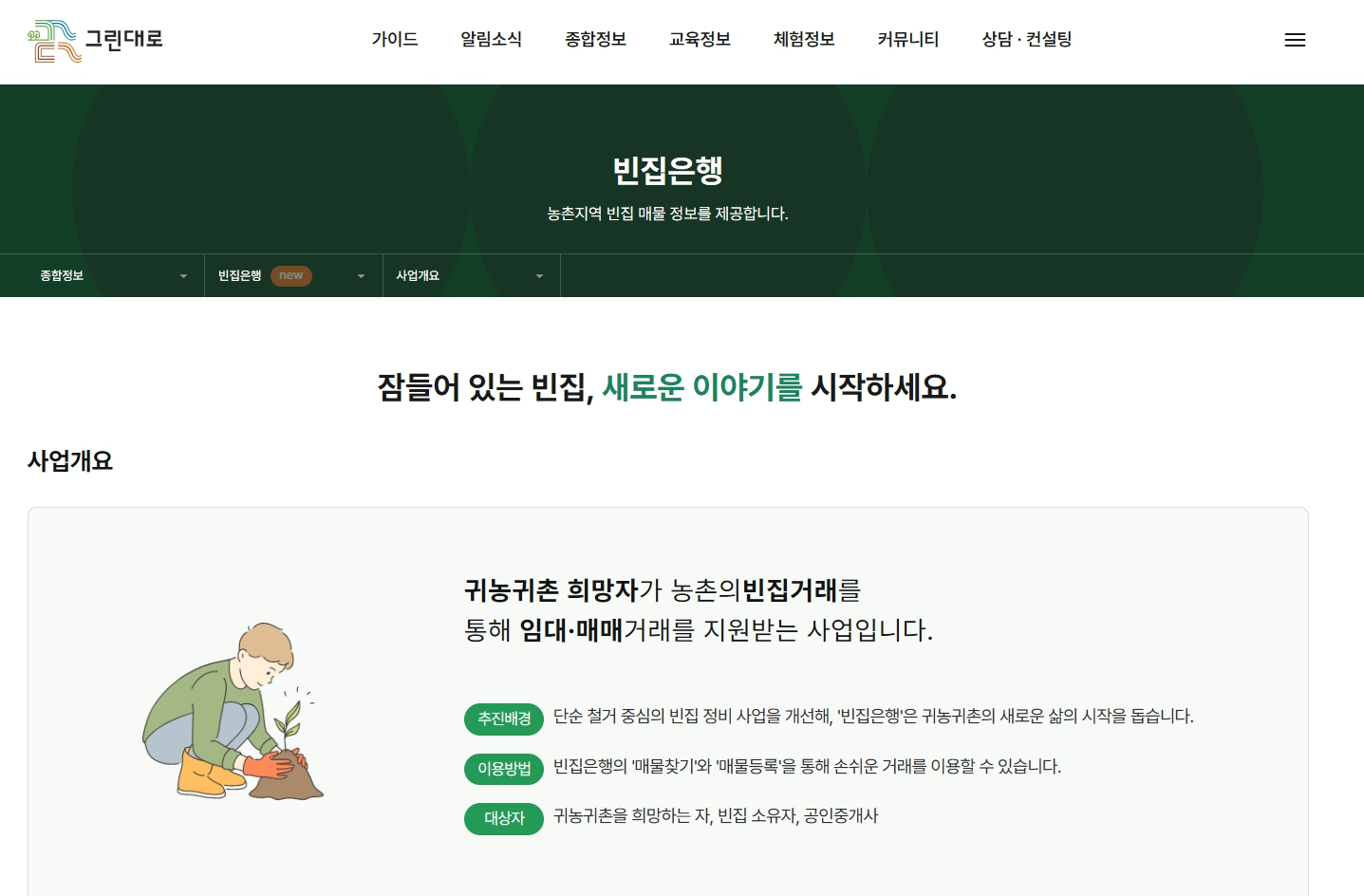 그린대로 홈페이지 - 빈집 은행 메뉴 - 매물 정보 검색 - 지자체 담당자 문의 및 현장 방문 - 계약 협의 및 체결