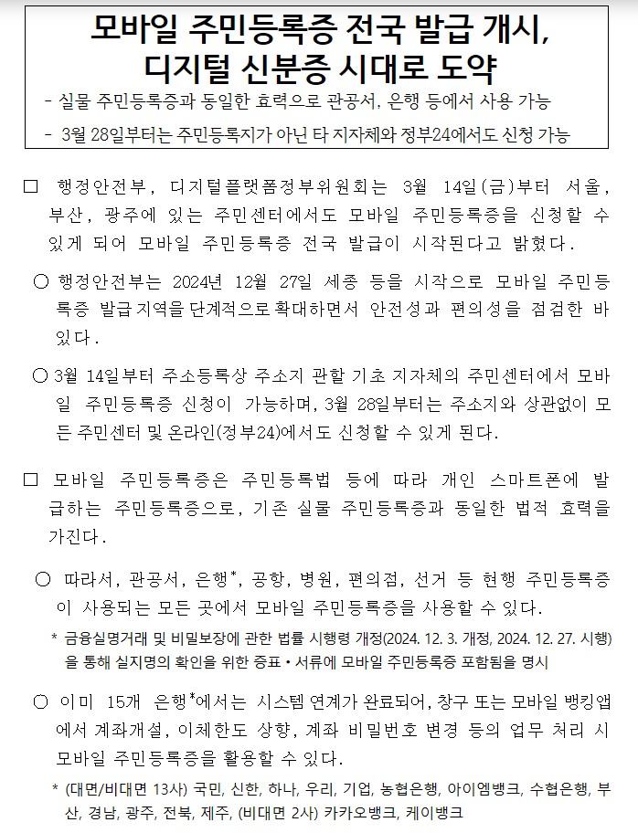 특히 2024년 12월 27일부터 개정된 금융실명거래법 시행령에 따라, 모바일 주민등록증은 법적으로 은행에서 실지명의 확인 수단으로 인정됩니다. 이미 15개 은행에서 시스템 연계를 완료해, 창구나 모바일 뱅킹앱에서도 적극 활용되고 있습니다.