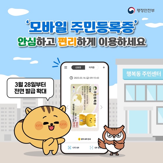 모바일 주민등록증은 기존 실물 주민등록증과 동일한 법적 효력을 가지며, 스마트폰에 저장해 사용하는 디지털 신분증입니다. 행정안전부와 디지털플랫폼정부위원회가 추진한 사업으로, 2024년 말부터 세종, 부산 등을 시작으로 시범 운영되었으며, 2025년 3월 14일부터 전국 주민센터에서 정식 발급이 가능해졌습니다. 특히 3월 28일부터는 주소지와 상관없이 모든 주민센터에서 신청이 가능하며, 정부24 앱을 통해서도 온라인 발급이 가능합니다. 모바일 주민등록증은 병원·관공서·은행 등에서 실물 신분증처럼 사용할 수 있으며, 블록체인과 암호화 기술을 활용한 고도 보안 시스템이 적용되어 안전하게 사용할 수 있습니다.
