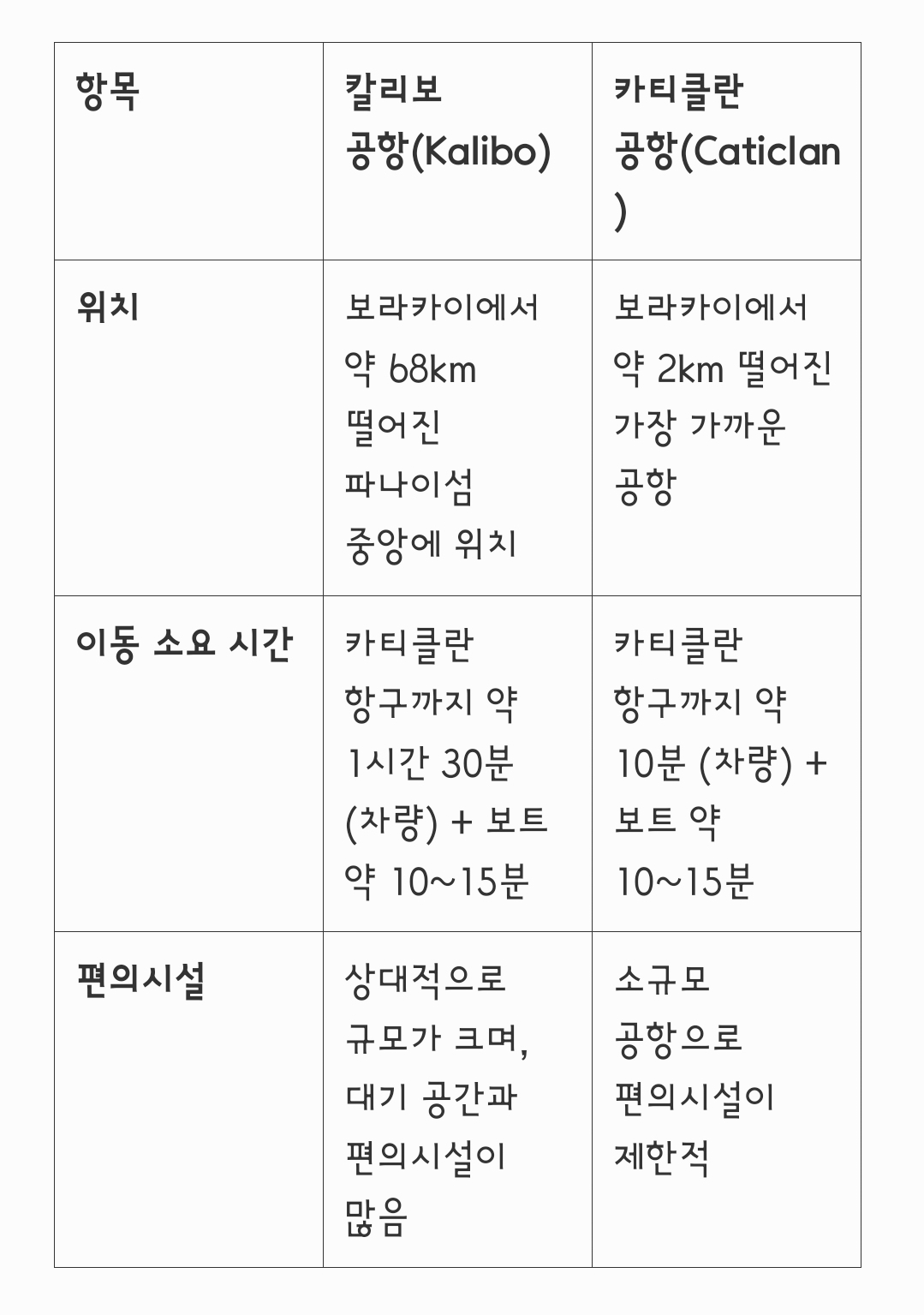 한국에서 출발하려면 칼리보(Kalibo) 국제공항 또는 카티클란(Caticlan) 공항 둘 중에 하나의 항공편을 예약해야 합니다.