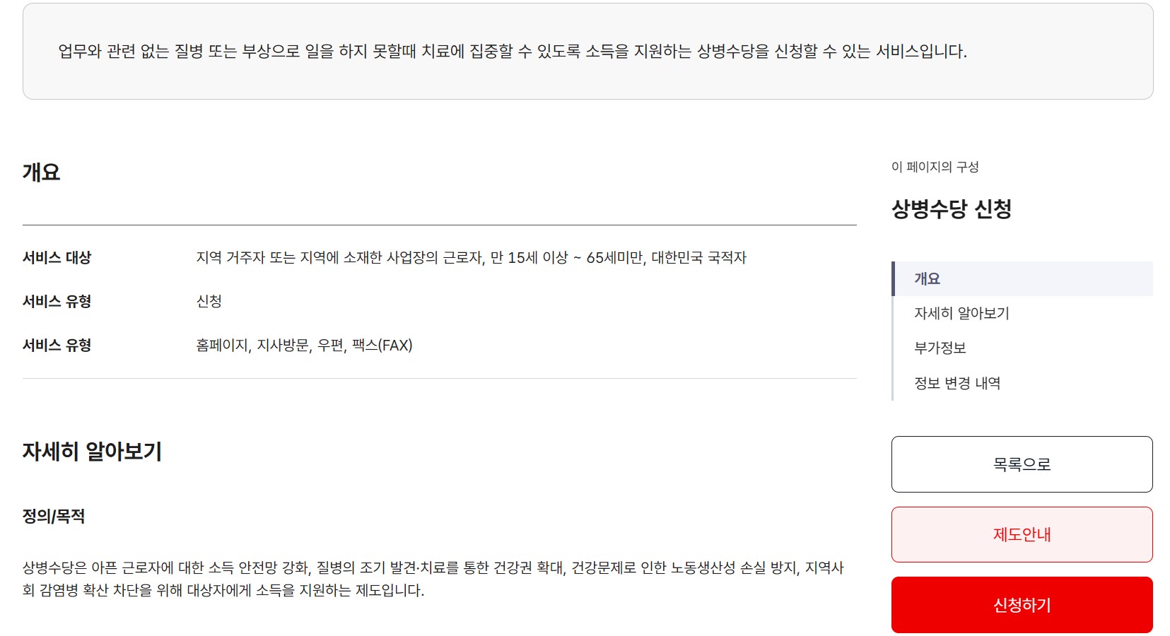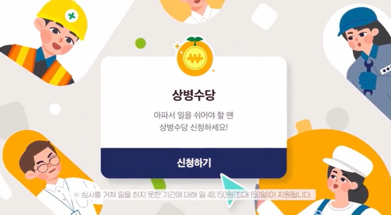 업무와 관련 없는 질병 또는 부상으로 일을 하지 못할때 치료에 집중할 수 있도록 소득을 지원하는 상병수당을 신청할 수 있는 서비스입니다.