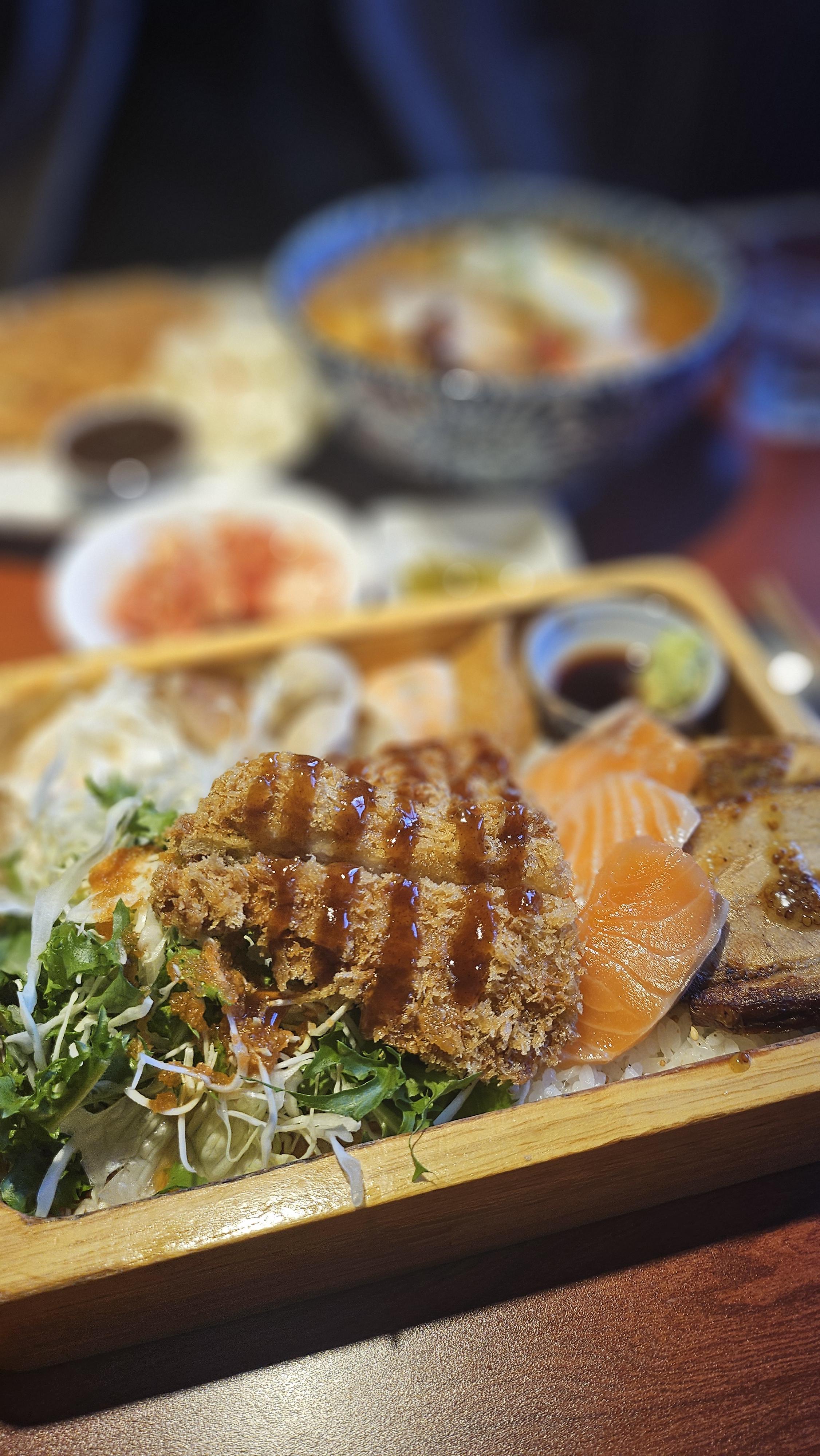 돈까스, 연어, 차슈 돼지고기 외에도 메추리알, 연어초밥, 유부초밥 한조각씩 귀엽게 나오고 샐러드류도 곁들여져있습니다. 밑에 밥이 깔려있어서 함께 먹었습니다. 김치류와 장국도 같이 나옵니다.