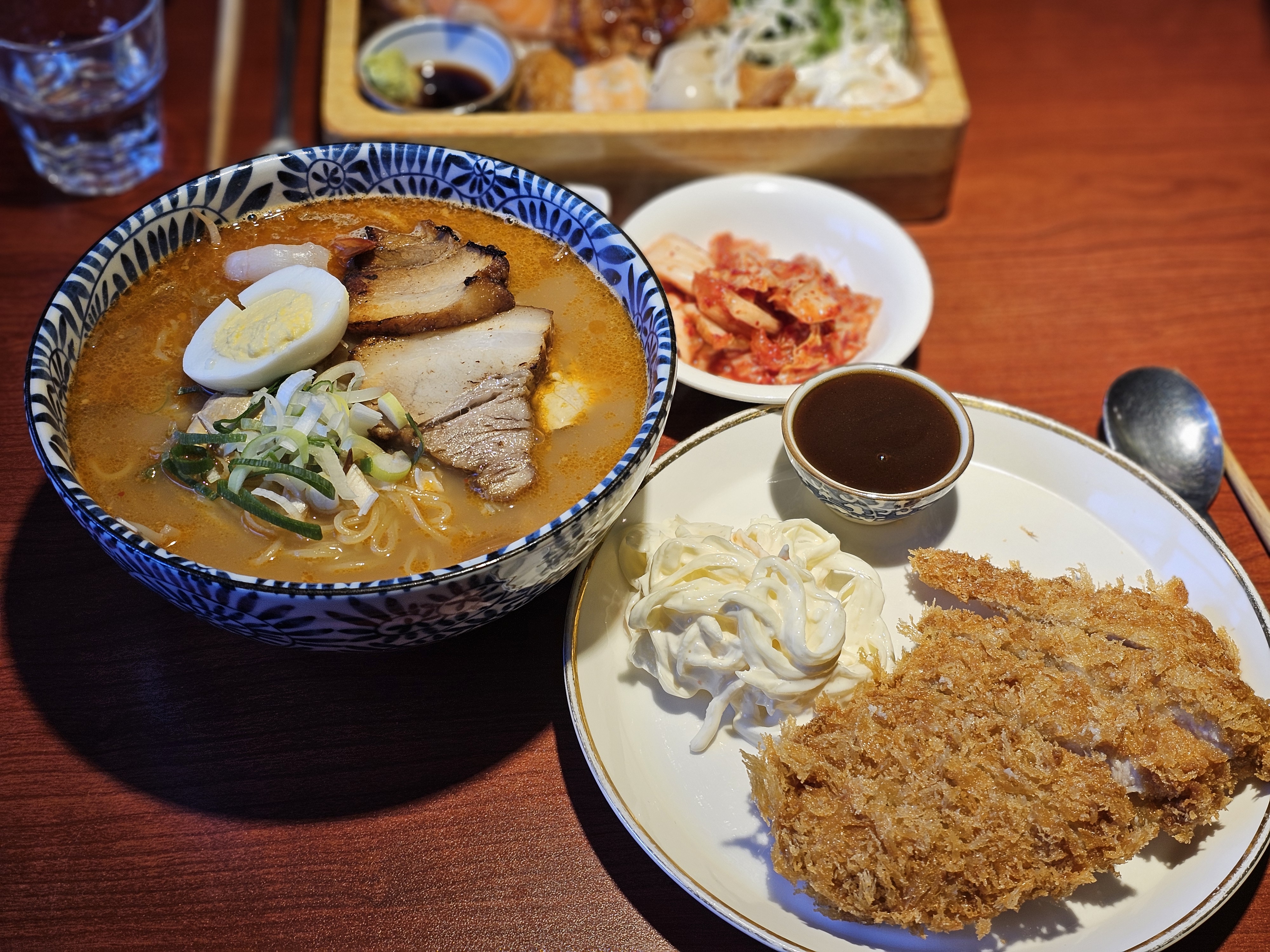 라멘은 미소장국 같이 안 매울줄 알았는데 해물류가 들어있어서 시원하지만 은근히 맵고 얼큰한 맛이 있습니다. 차슈, 계란, 새우 등 안에 든 내용물도 허술하지 않고 푸짐했습니다. 돈까스랑 함께 먹으니 매운 맛이 중화될 수 있네요.