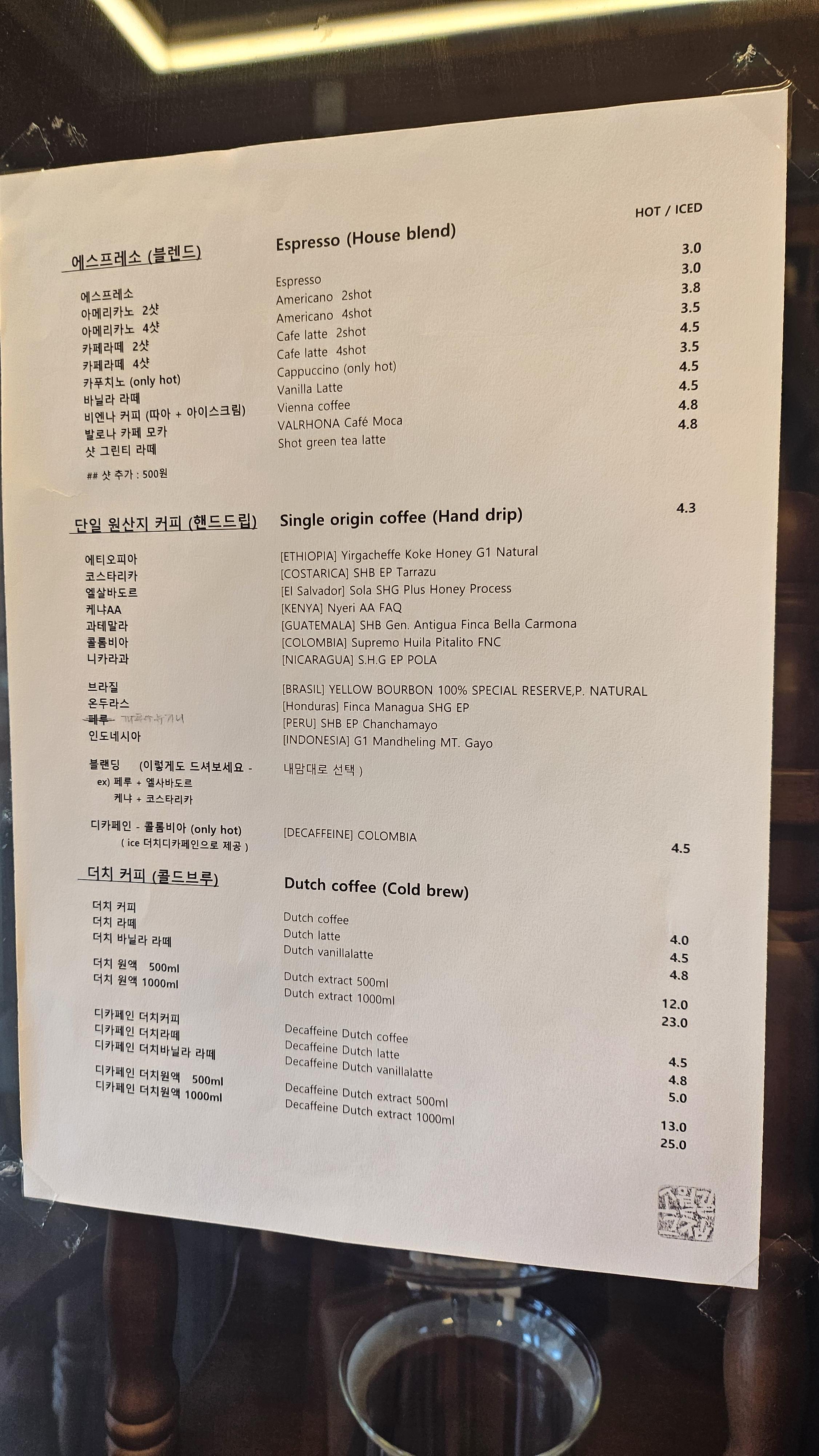 이정도로 원두에 진심인 커피 맛집이니 핸드 드립은 꼭 먹어봐야할 것 같은 느낌이 들었습니다. 온두라스 핸드드립 커피(4,300원)와 카페 라떼 2샷(3,500원)을 주문했습니다.