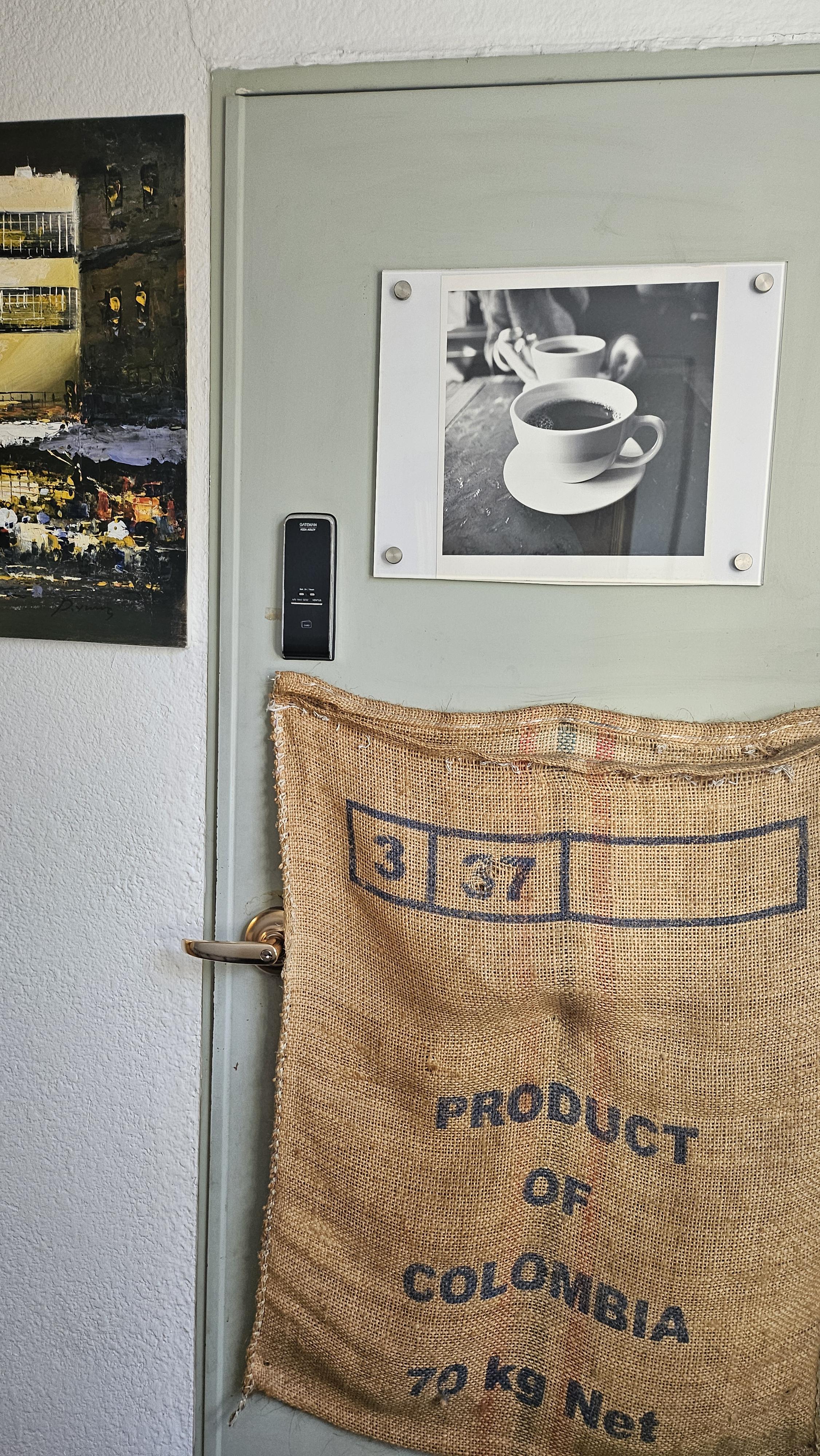 주문 후 커피를 받아서 2층으로 올라갔습니다. 1층 카페 옆 문으로 들어가서 2층으로 올라가면 이런 비밀의 문이 있습니다. 여길 열고 들어가면 2층 카페 자리입니다.