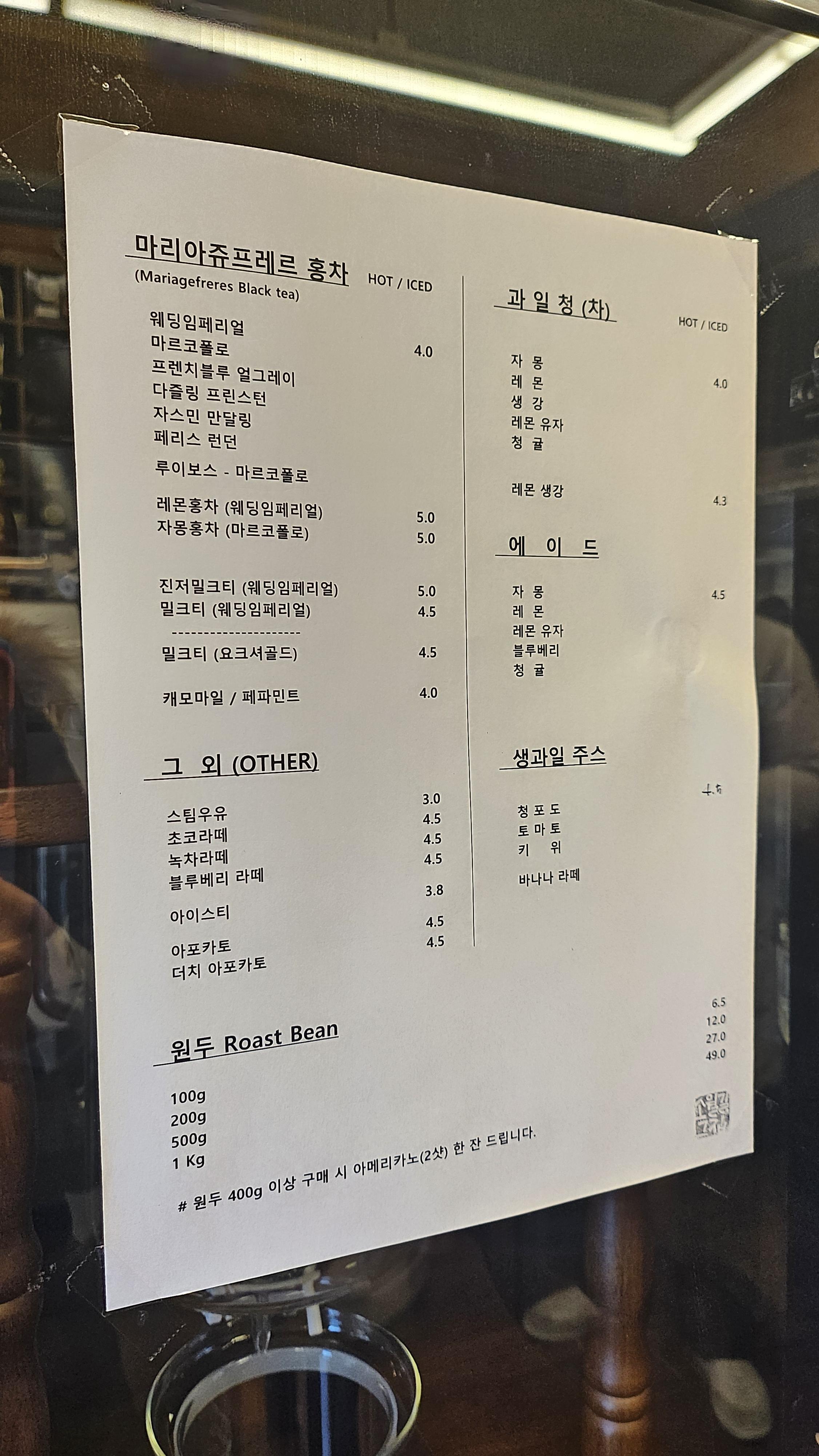 커피 외에 다양한 티와 과일청, 에이드 음료도 판매하네요. 원두는 g 무게별로 판매중입니다.