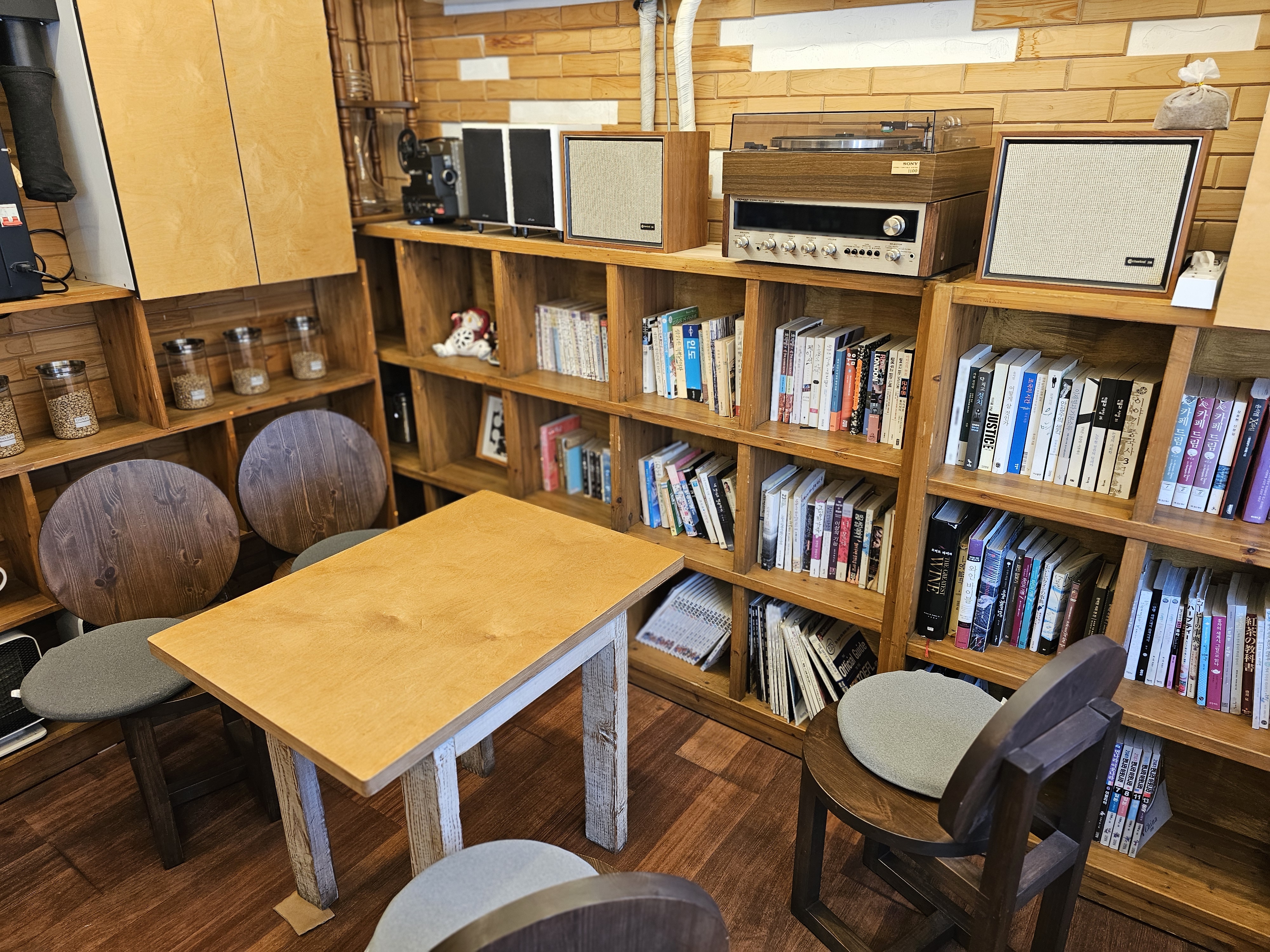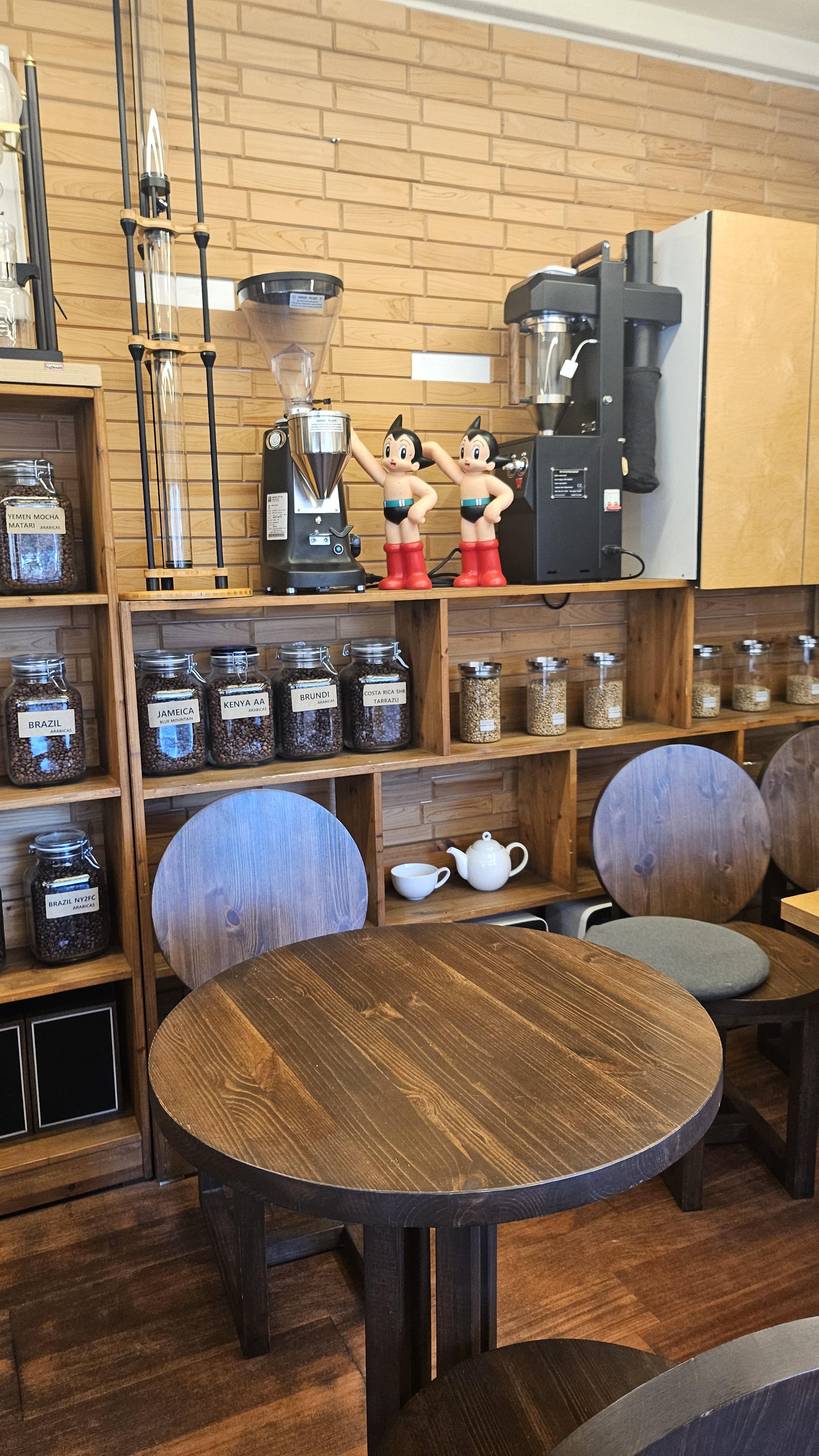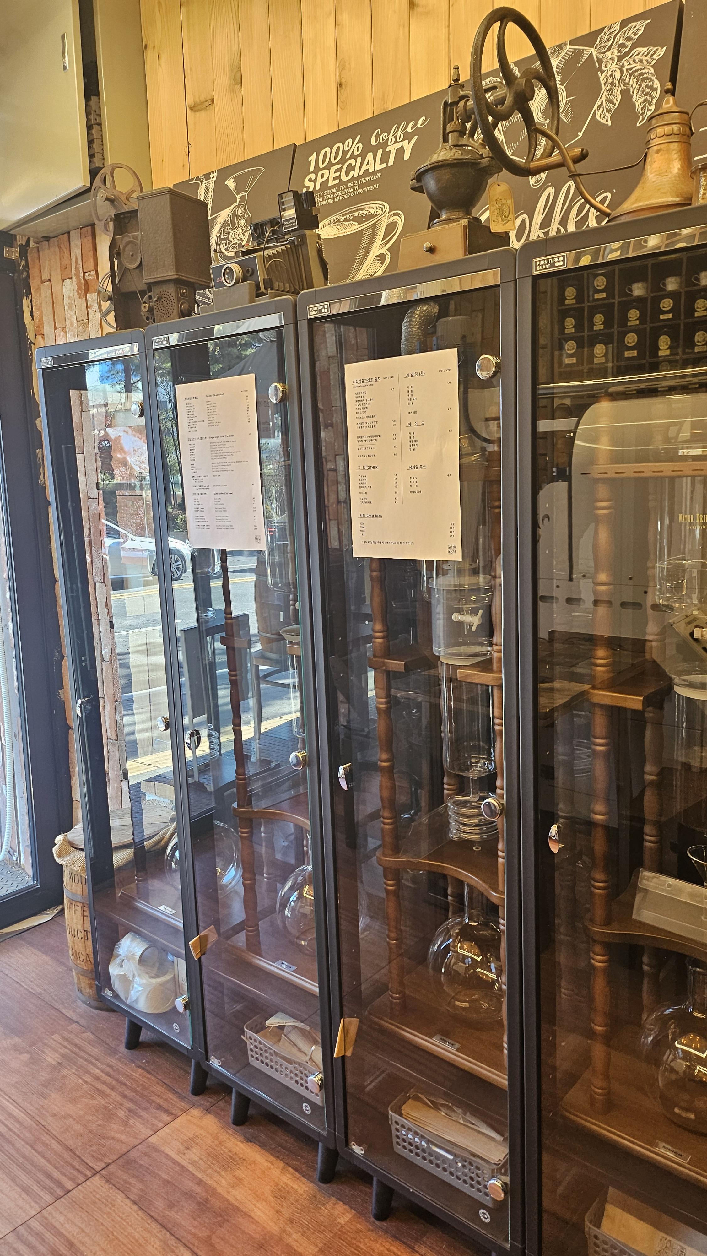 2층도 원목 느낌의 따뜻한 인테리어입니다. 4개 정도의 테이블이 있습니다. 원목 가구들이라 의자가 아주 푹신하고 편하진 않습니다. 다만 작은 공간에 오밀조밀 클래식한 스타일로 인테리어 소품을 이용해 꾸며두어서 보는 맛이 있습니다. 역시나 다양한 원두가 담겨져있는 통들이 그대로 인테리어 효과를 톡톡히 해주네요.