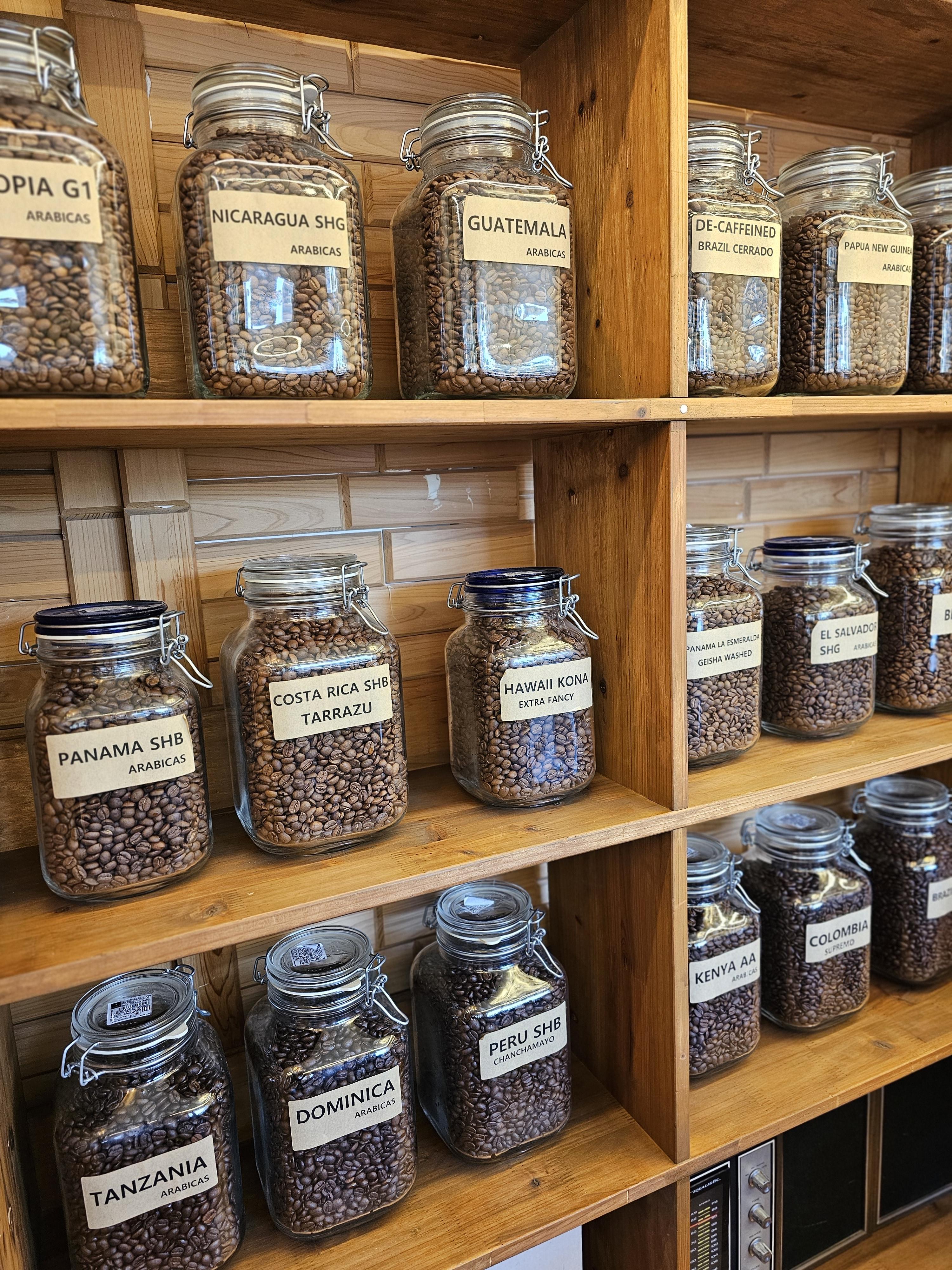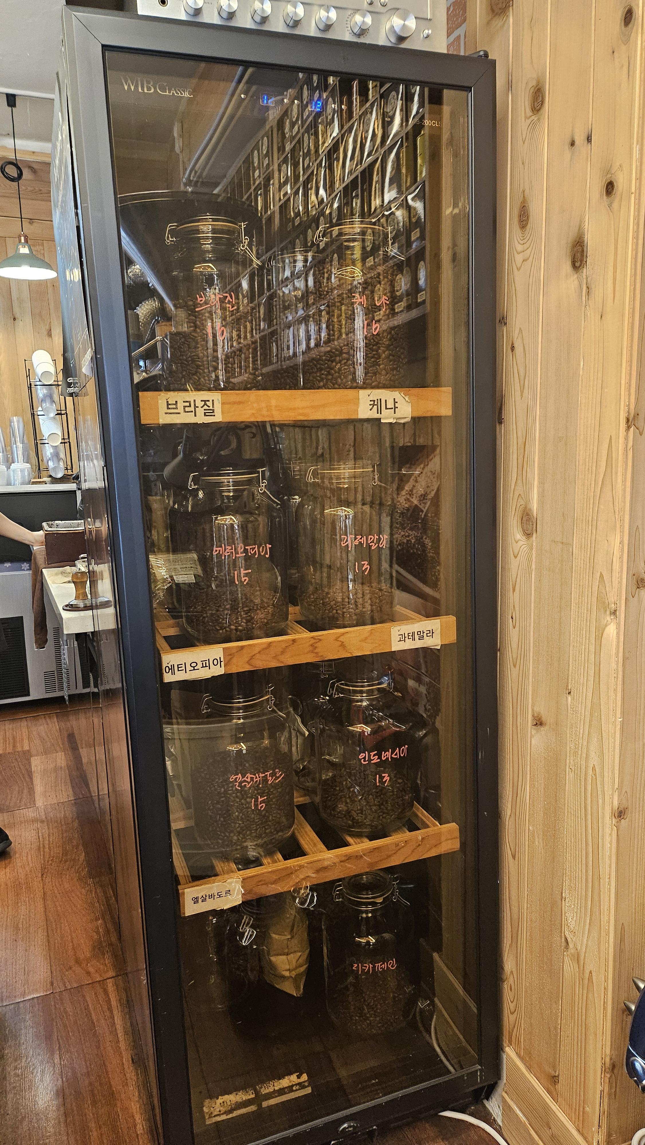 1층 입구 들어서자마자 여러 커피 머신들과 원두들이 보여서 전문적인 느낌이 물씬 풍겼습니다. 뭔가 진짜 맛있는 커피를 만날 수 있겠다는 기대감이 한껏 부풀만 하죠. 한쪽에는 브라질, 케냐, 에티오피아, 과테말라, 엘살바도르 등 다양한 원산지의 원두가 가득 채워져있었습니다. 생 커피콩을 그대로 보는 것만으로도 든든하네요.