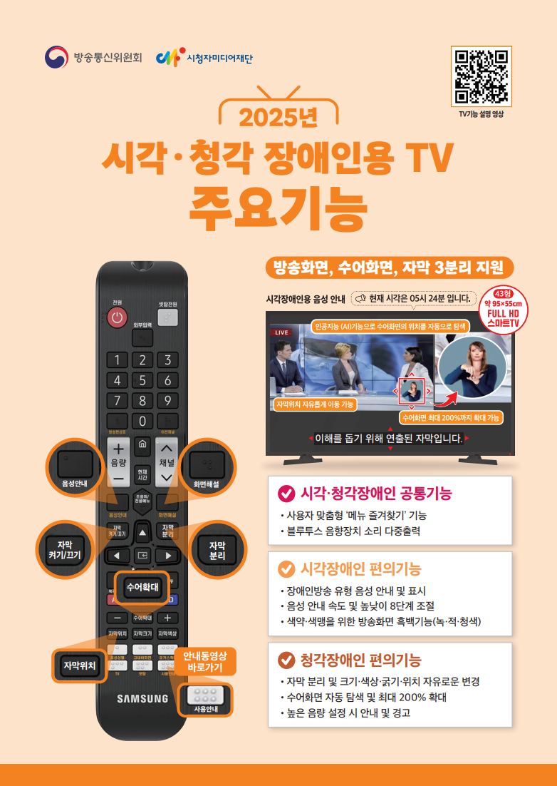 2025년 방송통신위원회와 시청자미디어재단은 시각‧청각장애인의 방송 접근권 향상을 위해 시각청각장애인맞춤형TV 보급사업을 시행합니다. 올해는 삼성의 43인치 스마트TV로 기능이 더욱 강화되었으며, 무상 또는 유상 보급이 진행됩니다. 이 글에서는 2025년 기준 지원사업 내용, 신청대상, 신청방법, 선정 절차, TV 제품정보, 자주 묻는 질문(FAQ)까지 한눈에 보기 쉽게 정리해드립니다.