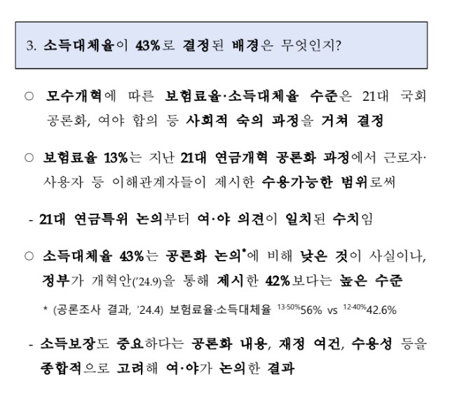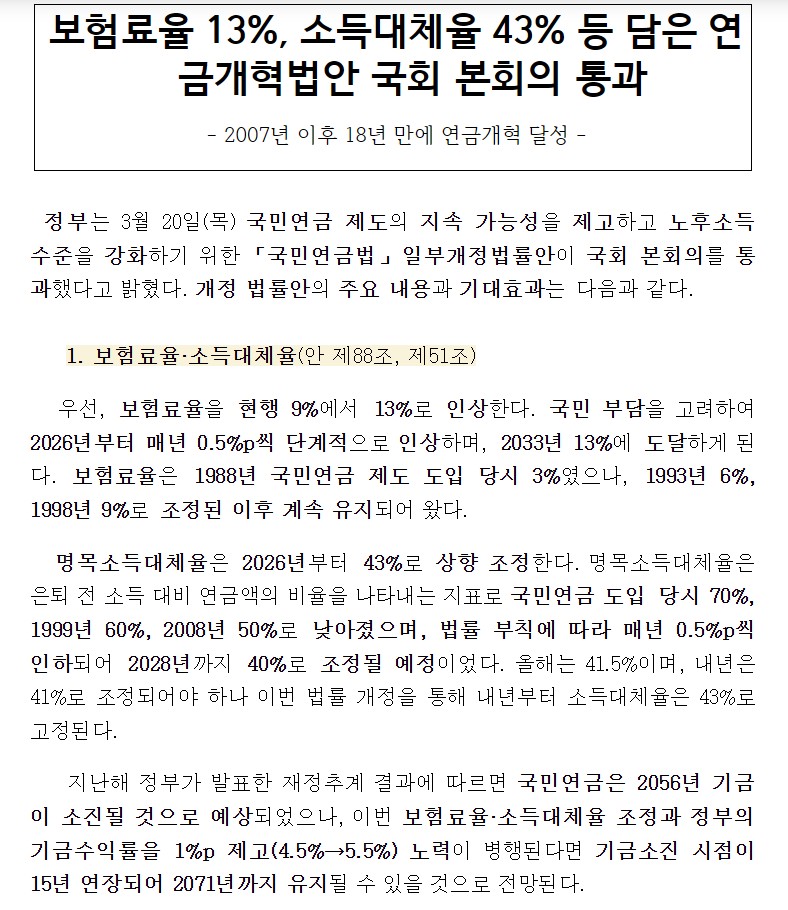 - 소득대체율 상향: 2026년부터 기존 계획보다 높은 43%로 고정 (기존 2028년까지 40%로 하향 예정이었음)