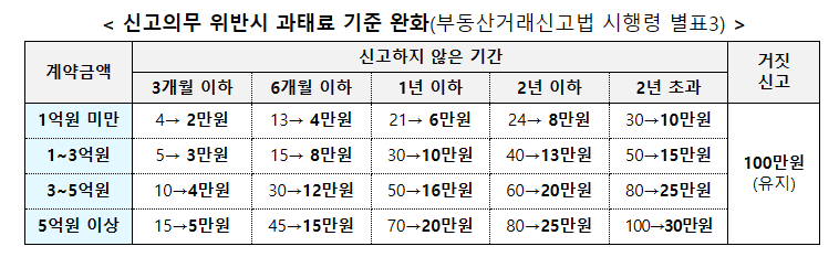 기존에는 신고하지 않으면 최대 100만 원까지 과태료가 부과됐지만, 서민 부담 완화를 위해 최대 30만 원까지로 하향되었습니다. 특히 실수로 늦게 신고한 경우를 고려해 기간별로 과태료가 차등 적용됩니다. 단, 고의적 허위 신고는 예외 없이 최대 100만 원입니다. 과태료는 계약금액에 따라 세분화되어 적용되며, 1억 미만일 경우는 최저 2만 원부터 시작합니다.