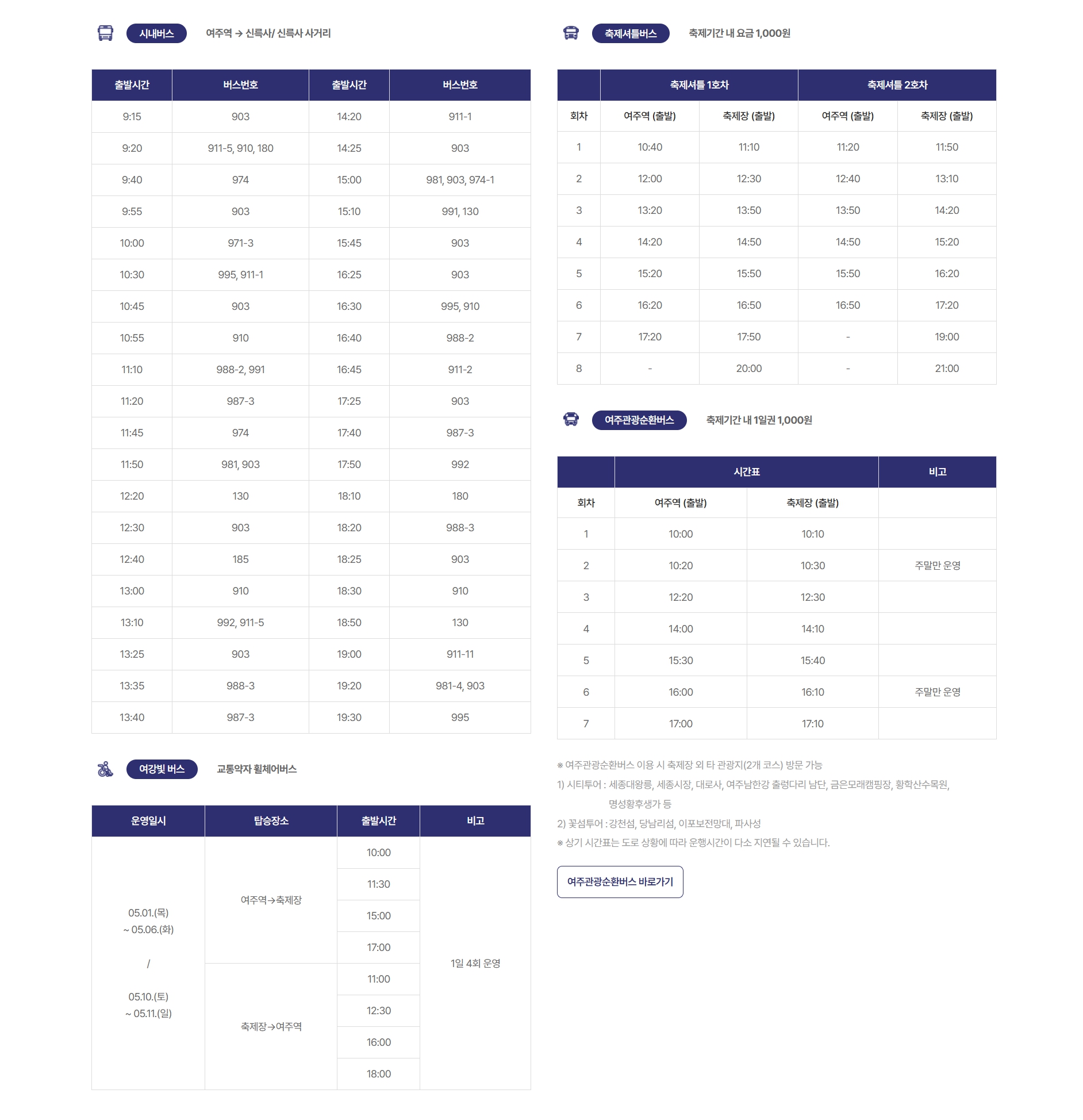 축제기간 동안 여주 시내 및 주요 지점에서 셔틀버스가 운행됩니다. 승차 간격은 약 30분이며, 첫차와 막차 시간은 다음과 같습니다.