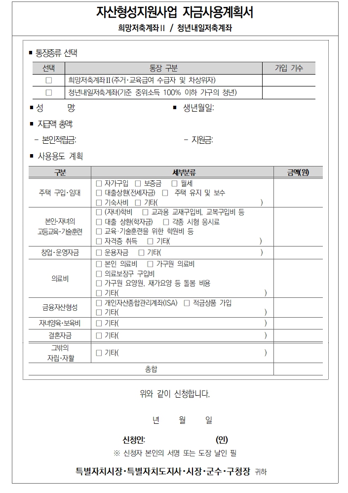 - 온라인 신청: 복지로, 자산형성포털 홈페이지