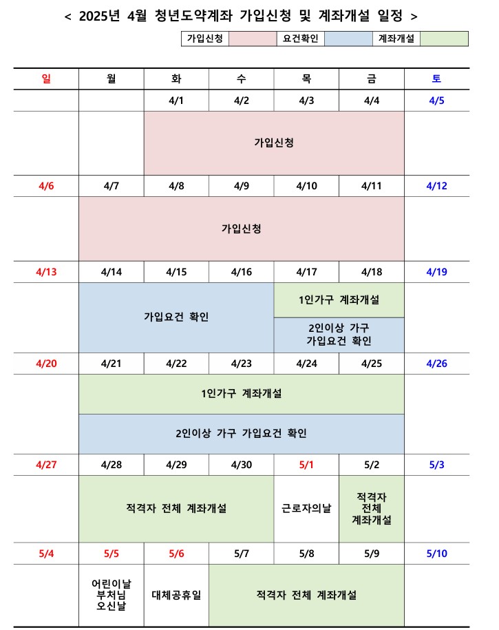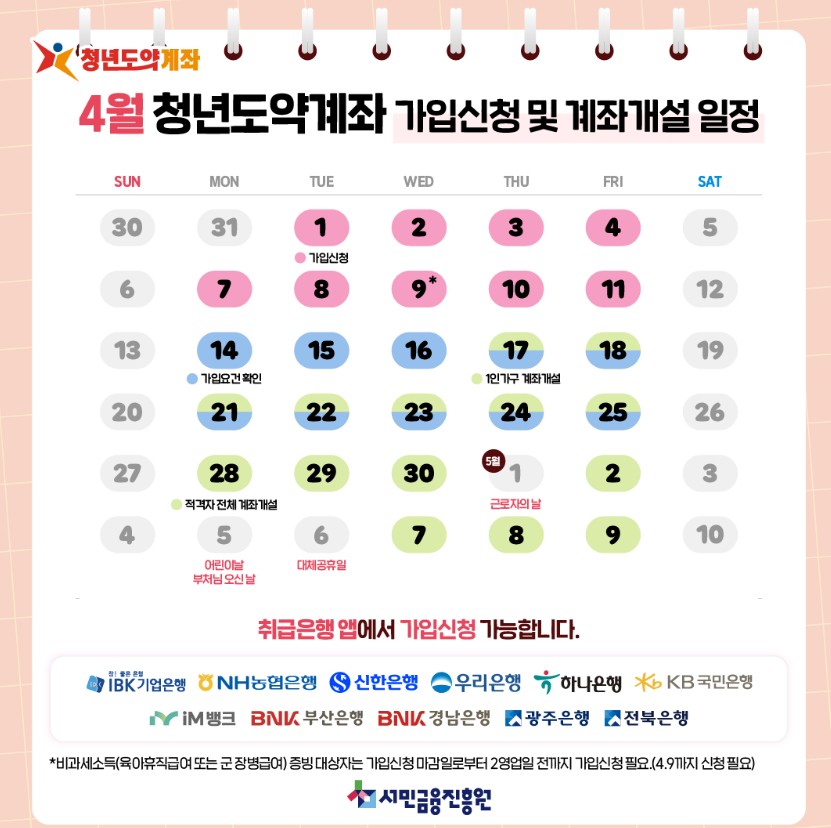 신청은 매달 진행되며, 은행에 직접 가지 않고 앱으로 비대면 신청할 수 있어 편리합니다. 4월 청년도약계좌 가입신청일은 4월 1일부터 4월 11일까지 입니다. 신청은 아래 순서대로 진행됩니다: