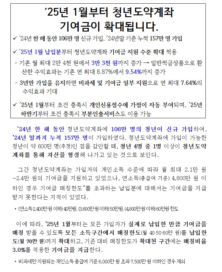 2025년, 더 강력해진 청년도약계좌가 돌아왔습니다. 무려 173만 명의 청년들이 선택한 이 제도는 올해 새롭게 개편되며 실질적인 혜택이 한층 더 강화되었습니다. 매달 적금처럼 돈을 넣으면 정부가 지원금을 얹어주고, 이자에 세금도 부과되지 않아 훨씬 유리하게 돈을 모을 수 있습니다. 특히 올해부터는 3년 이상 유지하면 비과세와 정부기여금이 보장되고, 2년 이상 유지하면 중도에 일부 인출도 가능해졌습니다. 여기에 성실하게 납입한 청년은 신용점수에 긍정적인 평가도 받을 수 있어 실속 있는 자산형성 수단으로 주목받고 있습니다. 예를 들어, 월 70만 원을 저축하면 소득에 따라 정부가 최대 3만 3천 원까지 추가로 지원해줍니다. 지금부터 2025년 청년도약계좌의 가입 조건, 신청 방법, 혜택, 유지 방법까지 쉽게 풀어 설명드릴게요.