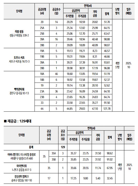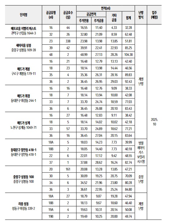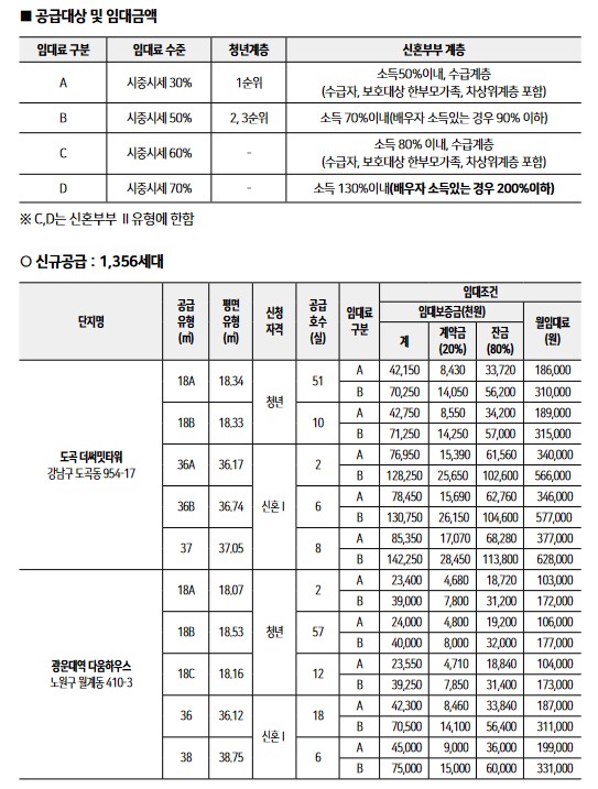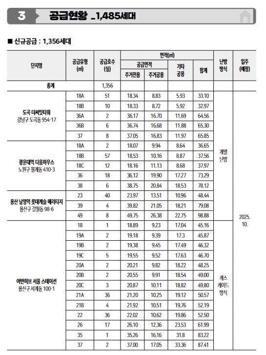 2025년 1차 모집에서는 총 1,485세대가 공급되며, 이 중 신규공급이 1,356세대, 재공급이 129세대입니다. 단지별 공급면적은 다양하며, 주거전용 기준으로는 약 5평(16㎡)부터 15평(49㎡) 이상까지 구성되어 있습니다. 예를 들어 강남구 도곡동 ‘더써밋타워’는 전용 5.5평(18㎡)형 보증금 421만원, 월세 18만 6천원부터 시작하며, 노원구 광운대역 ‘다움하우스’는 전용 5.5평(18㎡)형 기준 보증금 234만원, 월세 10만 3천원 수준입니다. 가장 넓은 평형으로는 약 15평(49㎡)형도 있으며, 월세는 40~60만원대로 책정되어 있습니다. 단지마다 난방 방식, 층수, 구조 등이 상이하므로 반드시 SH청약 홈페이지에 올라온 전자팸플릿을 참고하는 것이 좋습니다.