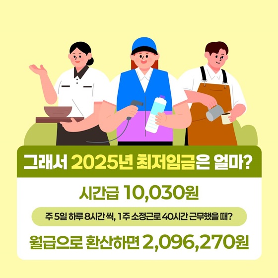 2025년 기준 대한민국 최저임금은 시급 10,030원입니다. 이는 하루 8시간 기준으로는 일급 80,240원, 주 40시간 근무 시 월급으로 환산하면 2,096,270원입니다. 이 최저임금은 고용형태와 상관없이 전 근로자에게 동일하게 적용되며, 위 금액은 주휴수당을 포함한 209시간 기준입니다. 정규직은 물론 알바, 단기근로자, 일용직 모두에게 법적으로 보장되는 최소 금액이라는 점에서 중요한 기준입니다. 급여가 이 기준에 미달한다면 법적 처벌을 받을 수 있기 때문에, 반드시 본인의 시급을 확인해보는 것이 좋습니다.