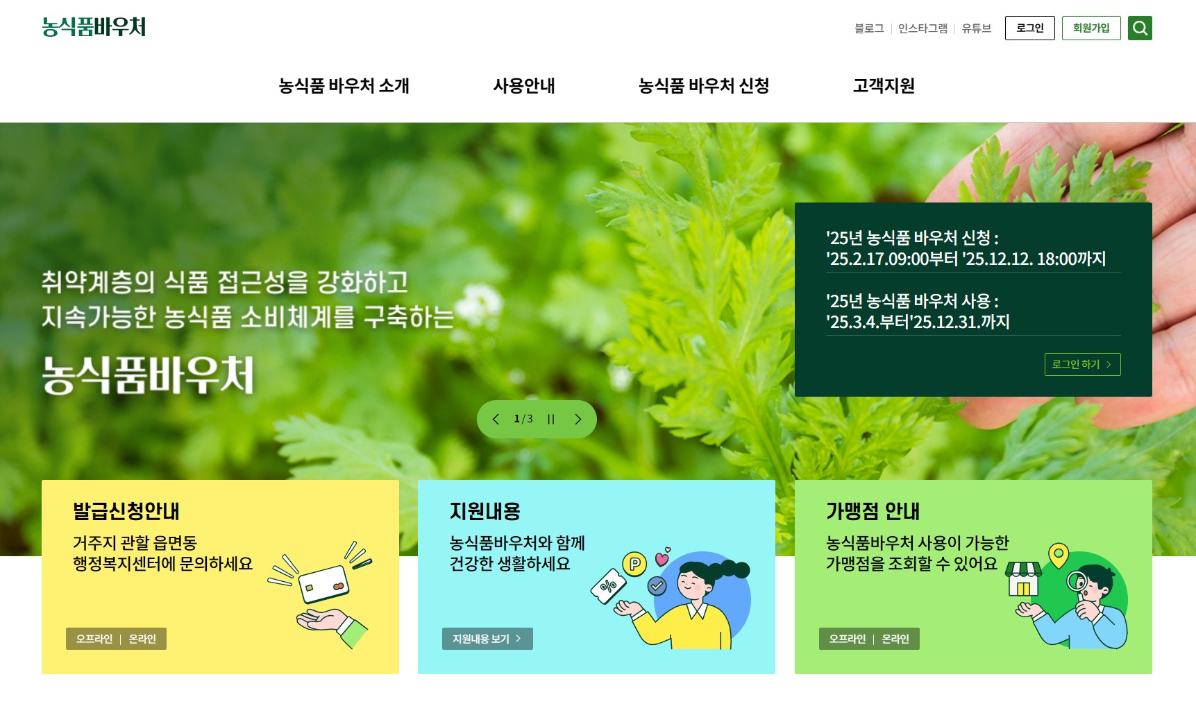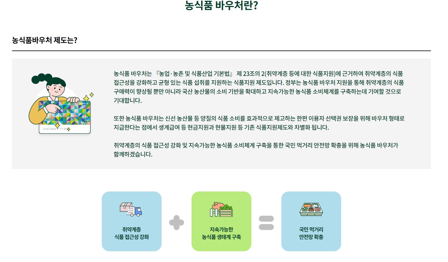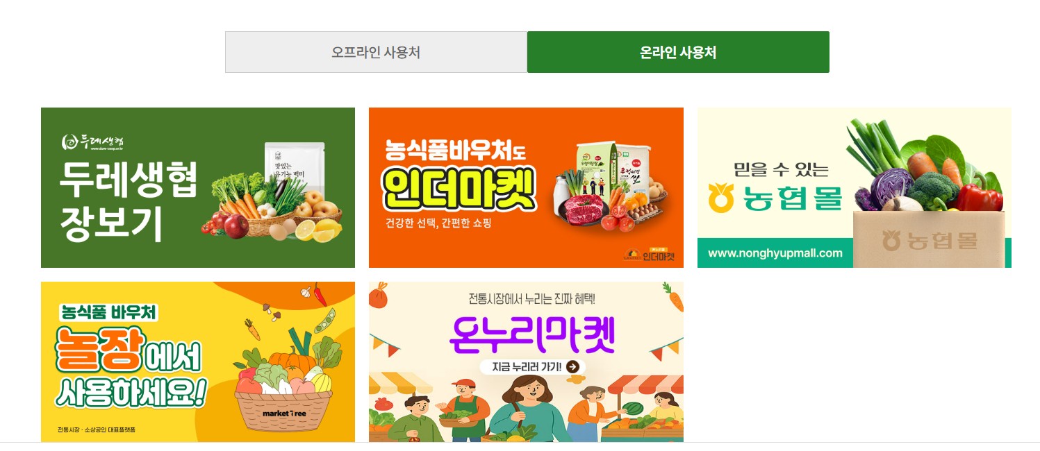 - 농협몰, 인더마켓, 온누리몰 등에서 바우처 카드 결제 가능