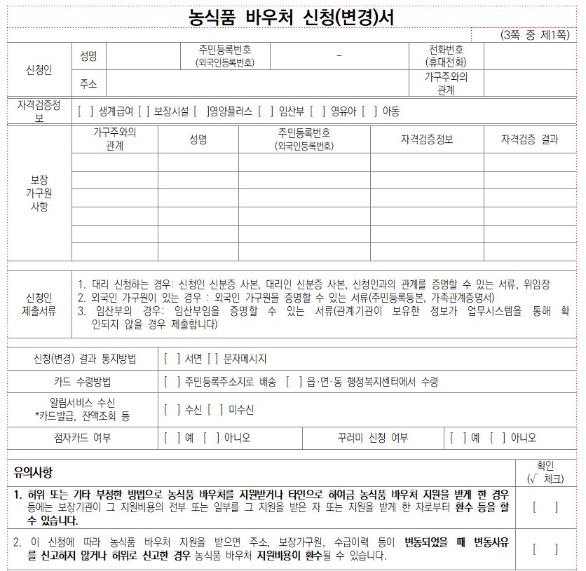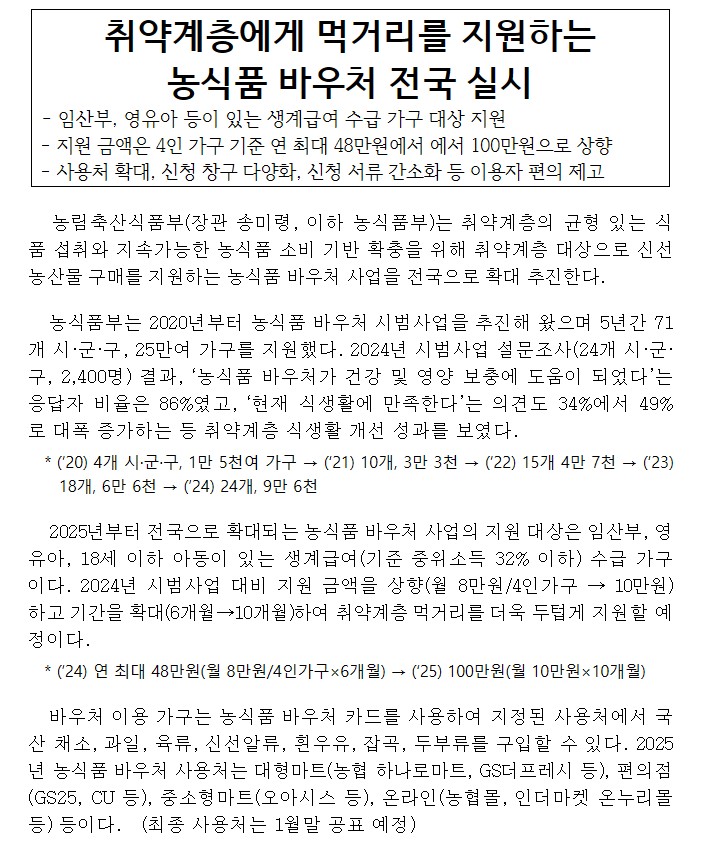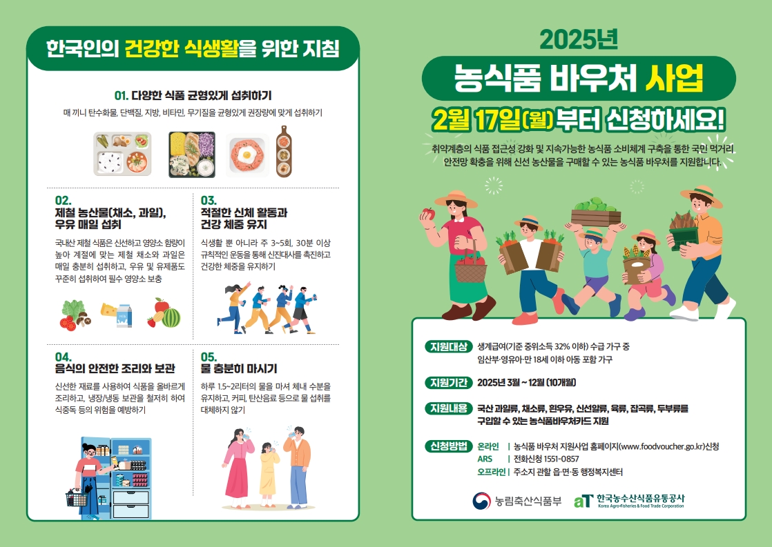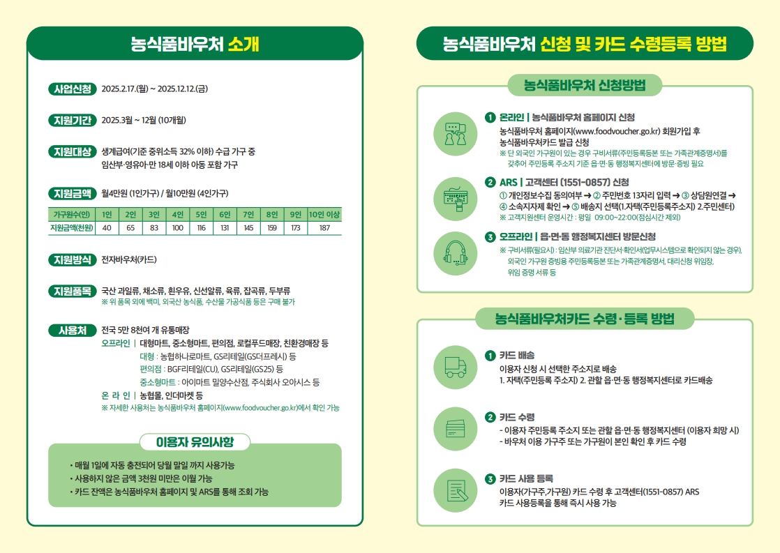 2025년부터 농식품바우처의 지원대상과 규모가 변동되어 전국적으로 확대 시행됩니다. 이 제도는 먹거리 취약계층의 건강한 식생활을 돕기 위한 정책으로, 특히 임산부나 영유아가 있는 생계급여 수급 가구를 중심으로 운영됩니다. 정부는 이번 확대를 통해 더 많은 국민들이 양질의 국산 농식품을 안전하게 섭취할 수 있도록 지원을 강화했습니다. 신청 방법은 방문뿐 아니라 전화와 온라인까지 가능하며, 사용처도 대형마트부터 편의점, 온라인몰까지 다양해져 접근성이 대폭 향상되었습니다. 이 글에서는 농식품 바우처 신청 대상, 신청 방법, 카드 발급 정보, 사용 가능한 품목 및 매장, 바우처 금액, 사용 기간 등 핵심 정보를 한눈에 보기 쉽게 정리해드리겠습니다.