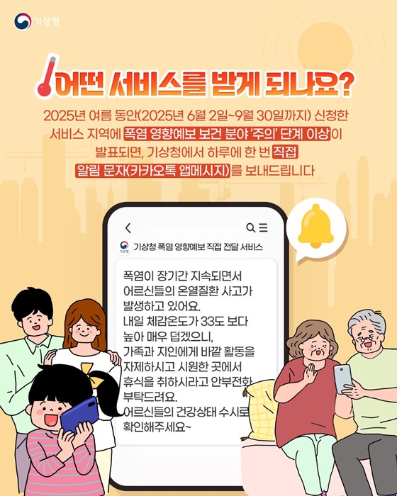 이번 여름, 기상청의 폭염 영향예보 직접 전달 서비스로 사랑하는 가족과 지인의 건강을 함께 지켜보세요.