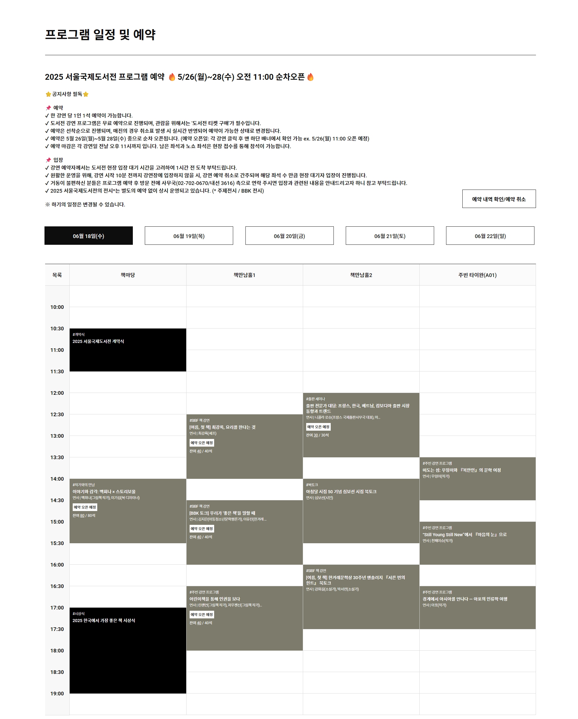 - 도서전 강연 및 세미나 참석을 위해서는 티켓 소지 필수, 강연 예약은 별도