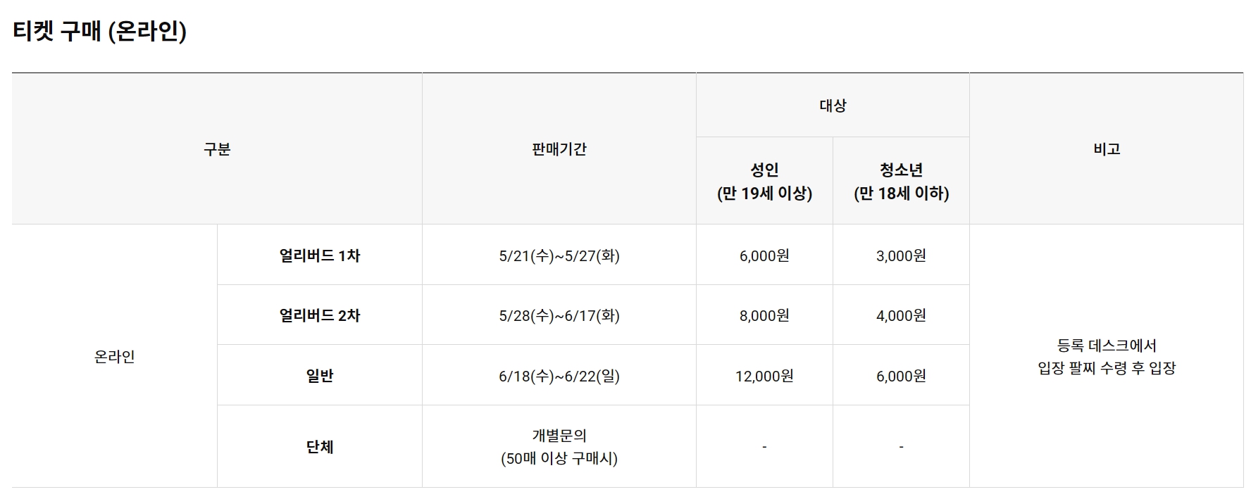 - 온라인 티켓은 일반 입장권으로, 우선 입장 혜택 없음