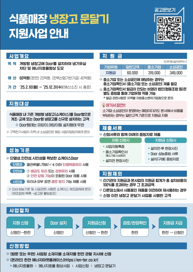 별도로, 식품매장의 기존 개방형 냉장고를 도어형으로 개조하거나 교체할 경우 최대 설치 면적(m²)당 25만 9천 원까지 지원하는 사업도 2025년 2월 10일부터 시행 중입니다. 해당 사업은 소상공인뿐 아니라 중소기업, 협동조합 등도 신청 가능하며, 한전:ON 홈페이지를 통해 신청할 수 있습니다.