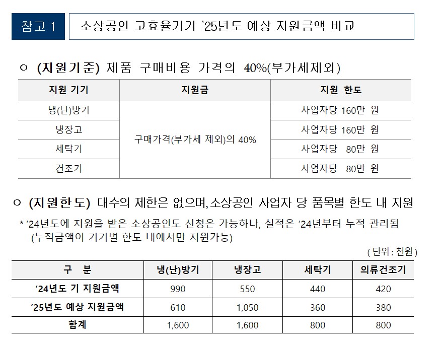 2025년 2월 17일부터 소상공인대상 고효율기기 지원사업이 시행됩니다. ※ 에너지효율등급 판정은 기기에 부착된 에너지효율등급 라벨 기준이며, 기타 증빙은 인정불가 ※ 2025년1월1일 이후 구매