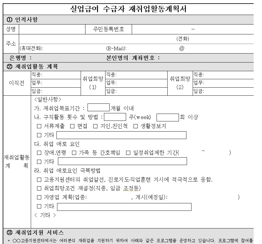 - 구직활동 내역: 온라인 지원, 채용설명회, 직업훈련 등 인정되는 활동만 기재