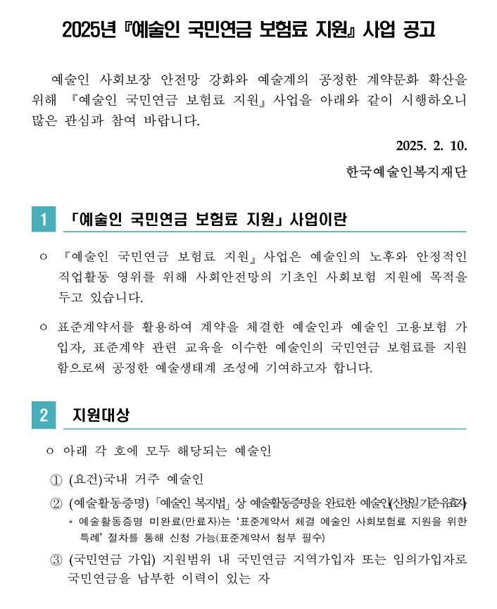 2025년에도 문화체육관광부와 한국예술인복지재단은 예술인의 노후 준비를 돕기 위해 ‘예술인 국민연금 보험료 지원사업’을 시행합니다. 예술활동에 전념하고 싶어도 소득 불안정, 국민연금 납부 부담으로 인해 어려움을 겪는 분들이 많습니다. 이 제도는 실제로 예술을 직업으로 삼고 활동 중인 예술인이 국민연금을 꾸준히 납부할 수 있도록 돕는 지원 정책입니다. 특히 올해는 신청 자격이 보다 명확해졌고, 예술인경력정보시스템과 연계된 온라인 신청 절차가 마련되어 한층 간편해졌습니다. 지금부터 예술인이라면 꼭 알아야 할 이 제도의 신청자격, 범위, 절차, Q&A까지 정리해드리겠습니다.