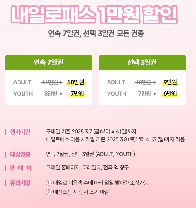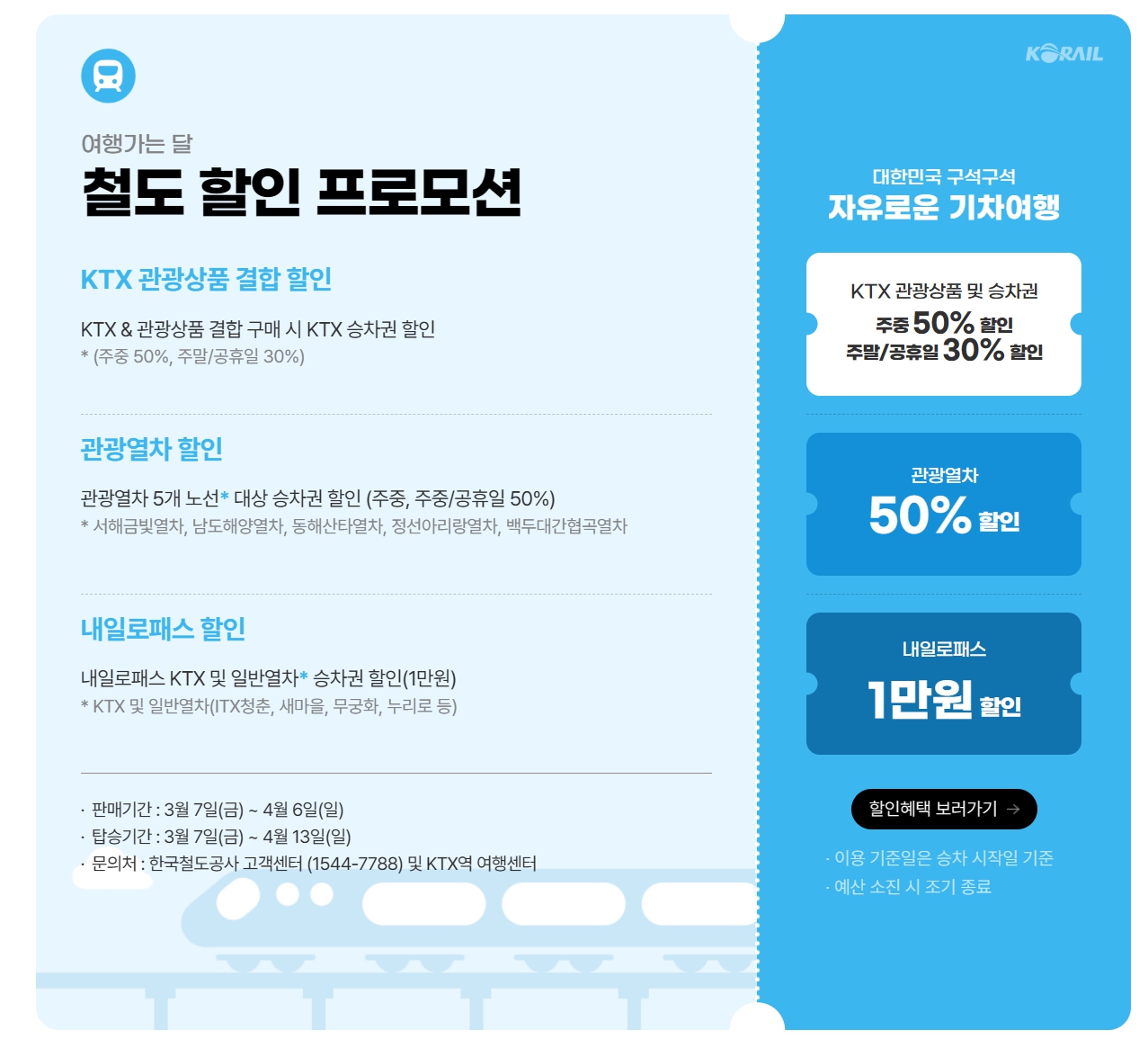 2025년 3월 7일(금)부터 4월 6일(일)까지 진행되는 ‘여행가는 봄 캠페인’ 기간 동안, 내일로 패스를 1만 원 할인된 가격으로 구매할 수 있습니다. 이번 할인은 KTX 포함형과 일반형 모두 적용되며, 내일로 패스 사용 가능 기간은 3월 7일(금)부터 4월 13일(일)까지입니다.