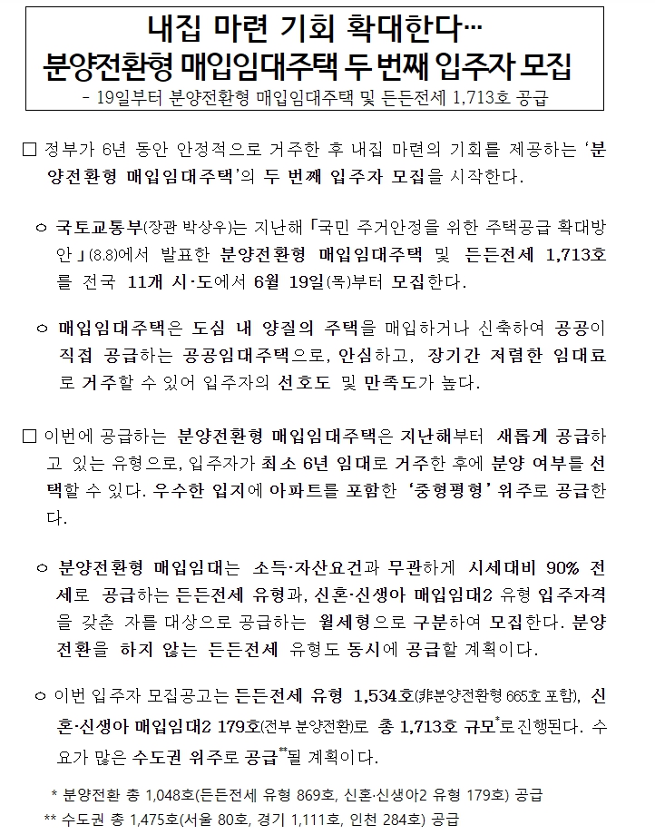 내 집 마련이 막막하신가요? 특히 서울이나 수도권처럼 집값이 높은 지역에서 안정적으로 거주하다가 내 집이 되는 방식이 있다면 참 매력적일 텐데요. 오늘 소개해드릴 ‘분양전환형 매입임대주택’은 바로 그런 제도입니다. 6년간 공공임대로 거주한 뒤, 자격 요건을 만족하면 분양으로 전환할 수 있는 방식이라 많은 분들이 관심을 갖고 있습니다. 특히 이번 2025년 2차 모집은 수도권 중심으로 총 1,713호 규모로 진행되며, 무주택자와 신혼부부, 자녀 출산 가구를 중심으로 공급됩니다. 이 글에서는 제도의 개념부터 신청자격, 공급 물량, 지역 정보까지 처음 접하시는 분도 쉽게 이해할 수 있도록 자세히 정리해드리겠습니다.