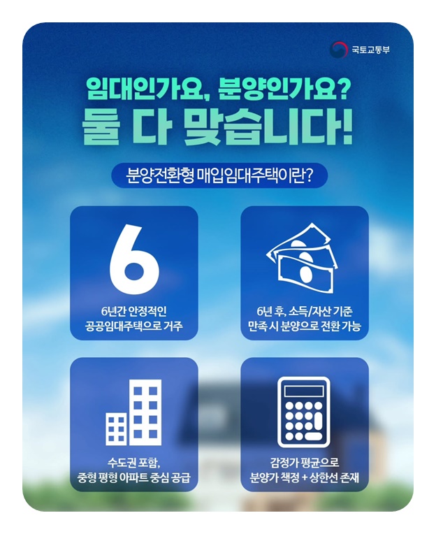 ‘분양전환형 매입임대주택’은 먼저 임대로 일정 기간 거주한 뒤, 일정 조건이 되면 분양으로 전환할 수 있는 주택입니다. 특히 공공임대로 6년 동안 저렴한 월세 또는 전세 형태로 거주하면서, 추후 내 집으로 만들 수 있다는 장점이 있습니다. 공급 주택은 신축 또는 신축급 중형 평형 위주이며, 수도권 내 좋은 입지에 위치한 경우도 많습니다. 분양가는 입주 당시와 분양 전 시점의 감정가 평균으로 산정되며, 상한선이 있어 과도한 가격 상승을 막습니다.