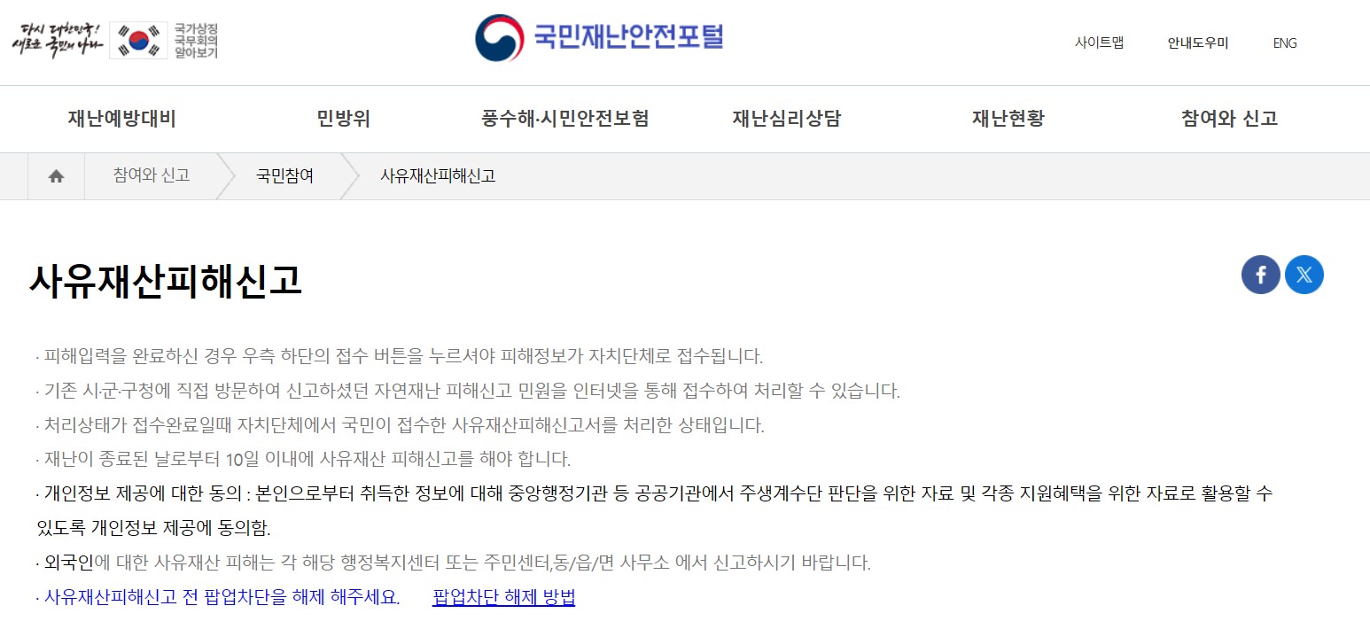 - 온라인: 국민재난안전포털 홈페이지 접속 → '참여와 신고' > '사유재산피해신고' 항목에서 서식 작성 후 제출 → 확인서 발급