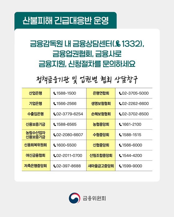 산불 피해와 관련된 자금 지원이나 제도 이용과 관련하여 문의가 필요한 경우 아래 기관별 상담처로 연락하실 수 있습니다. 각 기관은 지원 자격, 신청 방법, 유예 조건 등 실무적인 상담을 제공하므로, 상황에 맞는 기관에 직접 연락해 보시기를 권장합니다.