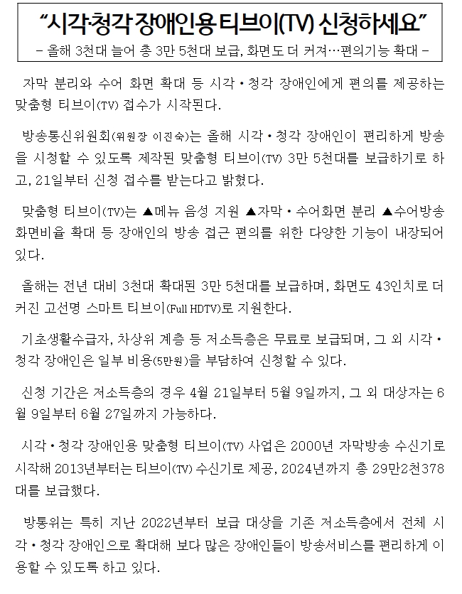 올해는 더 커진 화면, 강화된 기능, 개선된 신청 절차로 많은 분들이 더 나은 방송 환경을 누릴 수 있게 되었습니다. 대상이 되신다면 지금 바로 신청하세요. 접근성, 실용성, 품질까지 겸비한 스마트TV가 여러분을 기다리고 있습니다.