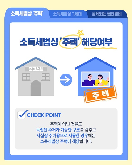 단순히 건물 용도만이 아닌, 실제로 주거용으로 사용했는가가 판단 기준입니다.예를 들어, 오피스텔이라도 주방과 화장실이 구비되어 있고, 실제로 사람이 거주한 흔적이 있다면 세법상 주택으로 분류됩니다.이는 1세대 1주택 비과세나 다주택 여부 판단에 직접적인 영향을 줍니다.즉, 단순히 '건물'이라고 하더라도 주거용으로 사용했는지 여부가 매우 중요하다는 뜻입니다.따라서 사용 용도와 실제 생활 여부를 잘 설명할 수 있도록 관련 증빙을 챙겨야 합니다.