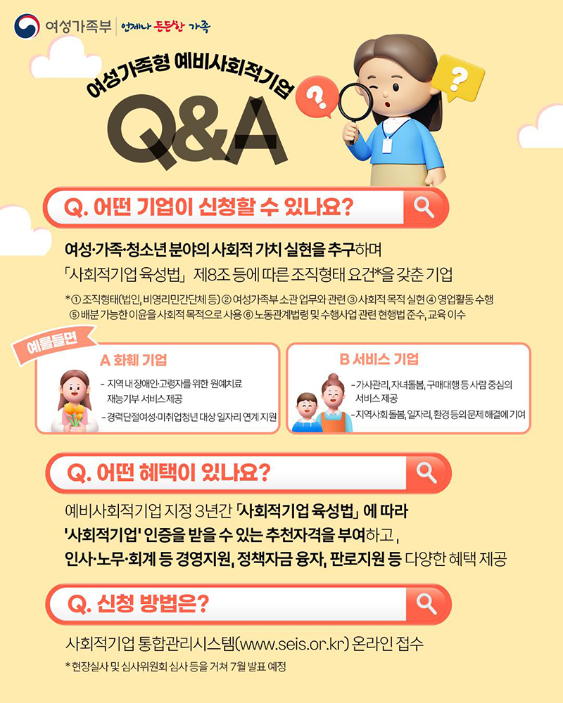 이런 고민을 하고 계셨다면, 지금이 기회입니다. 여성가족부가 매년 공고하는 ‘여성가족형 예비사회적기업 지정 제도’는 사회문제를 해결하는 활동을 기업 형태로 발전시키고자 하는 개인·단체에게 든든한 기반을 제공합니다.
