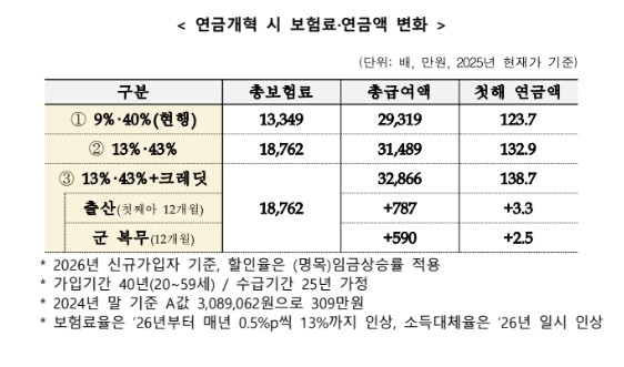 - 소득대체율 상향: 2026년부터 기존 계획보다 높은 43%로 고정 (기존 2028년까지 40%로 하향 예정이었음)