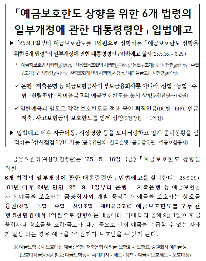 2025년 9월 1일부터, 예금자가 보호받을 수 있는 금액이 기존 5천만 원에서 1억 원으로 두 배 상향됩니다.