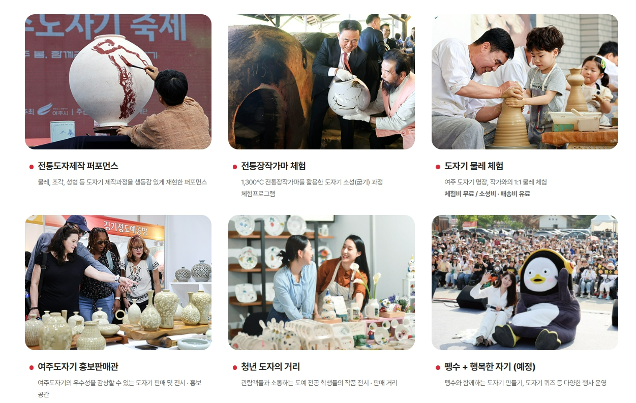 여주도자기축제는 경기도 여주에서 매년 5월 열리는 대표적인 문화예술 축제입니다. 여주는 예로부터 천연 고령토가 풍부해 도자기 산업이 발달한 지역이며, 이 전통을 이어받아 도자기의 아름다움을 알리고자 시작된 축제입니다. 특히 이 축제는 단순한 전시만이 아니라 직접 만들고, 만지고, 구워볼 수 있는 체험형 프로그램이 풍성하다는 점이 가장 큰 매력입니다. 어린이부터 어르신까지 모두가 참여할 수 있는 다양한 프로그램들이 있어 가족 단위 나들이 장소로 적합합니다. 또 축제 현장에는 푸드트럭, 특산물 장터 등 다양한 먹거리도 마련되어 있어 하루 종일 즐길 수 있는 축제입니다.