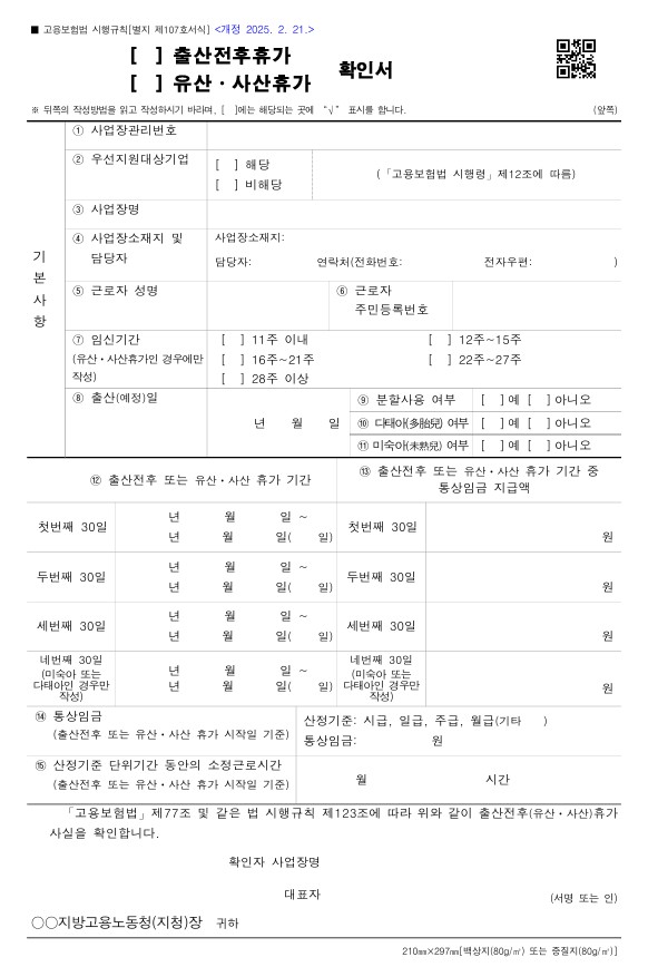 - 필요 서류: 출산휴가확인서, 임금대장, 통장사본 등