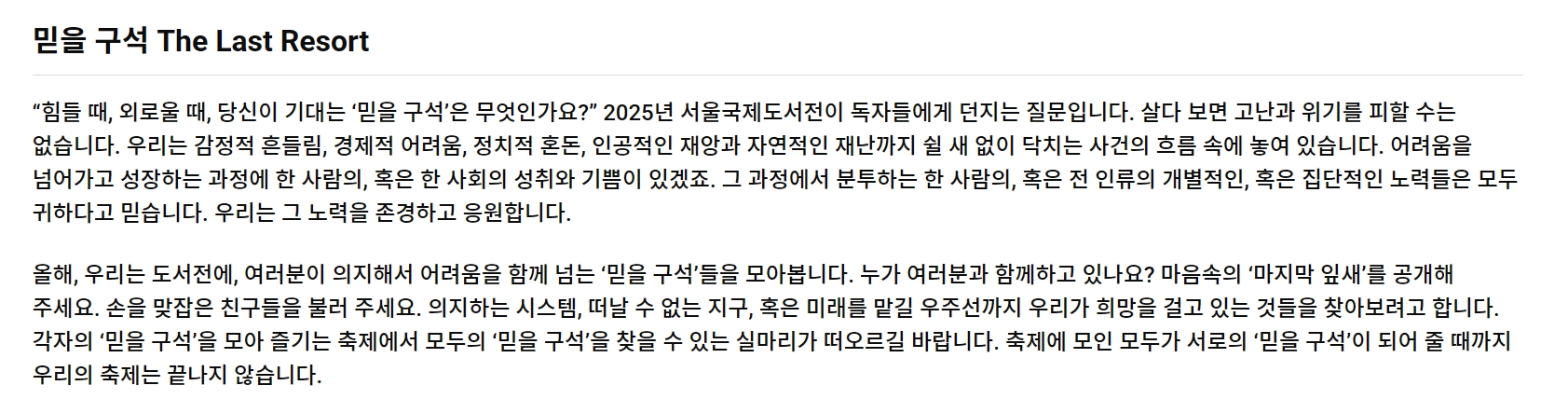 2. 2025 서울국제도서전 주제: ‘믿을 구석(The Last Resort)’
